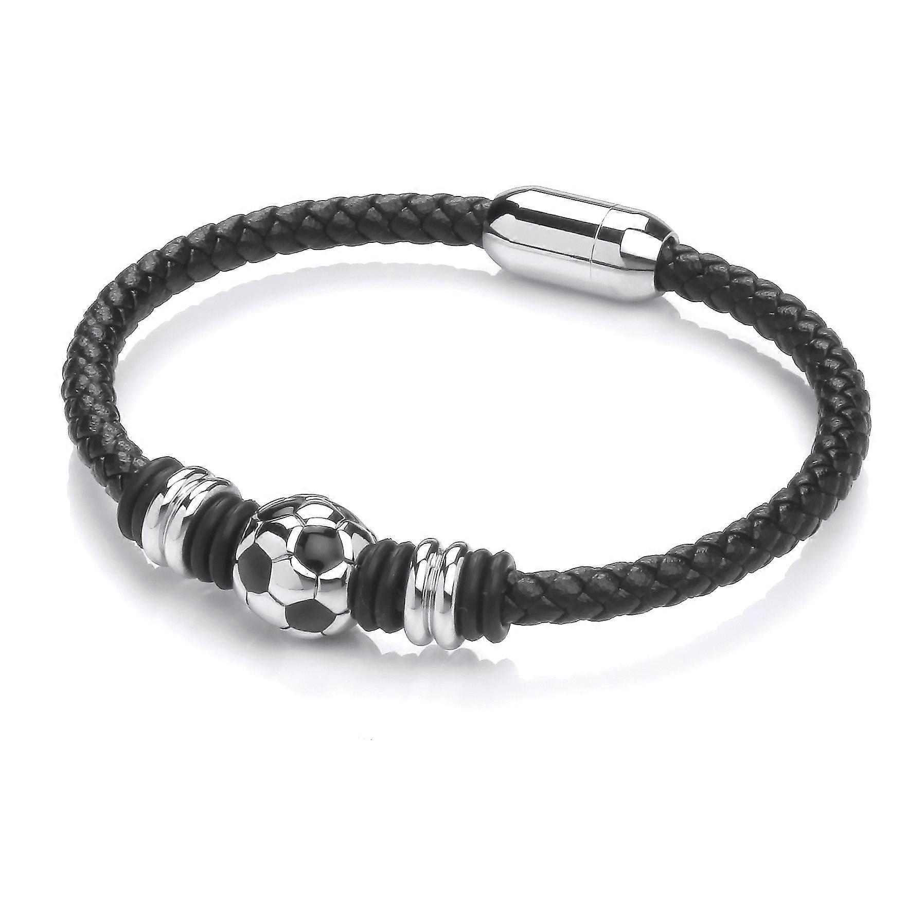 Jewelco London Mens Black Leather Stainless Steel Classic 32 Panel Football Soccer Ball Strap Bracelet 5mm 8 inch