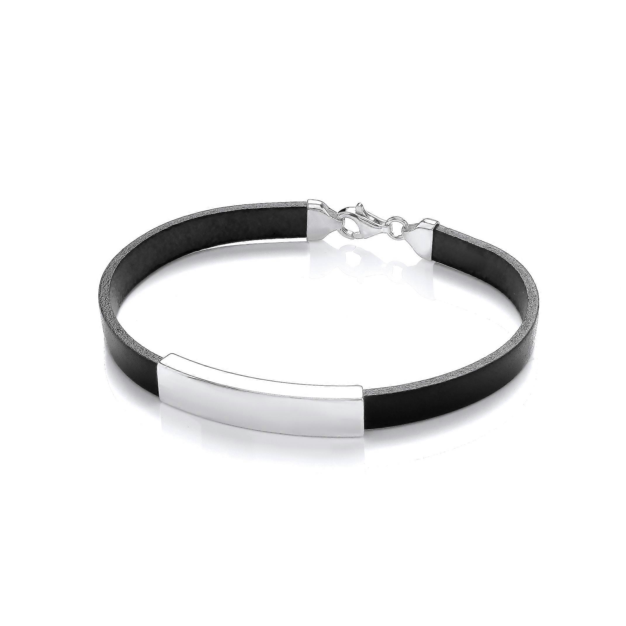 Jewelco London Mens Black Leather Stainless Steel Flat ID Bar Strap Bracelet 8mm 8 inch