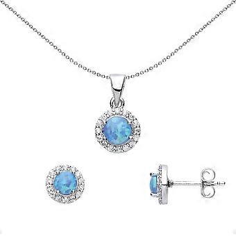 Jewelco London Ladies Sterling Silver Blue Opal Halo Earrings Necklace Set