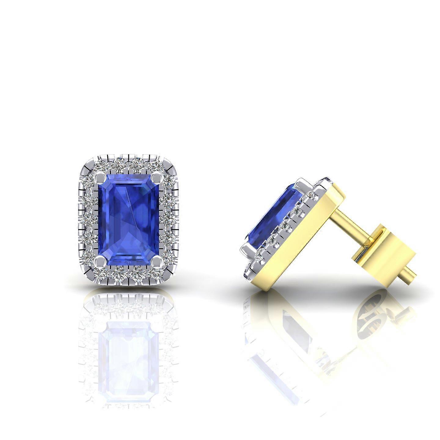 Jewelco London Ladies 2-Colour 9ct Gold Blue Emerald CZ Rectangular Solitaire Halo Stud Earrings