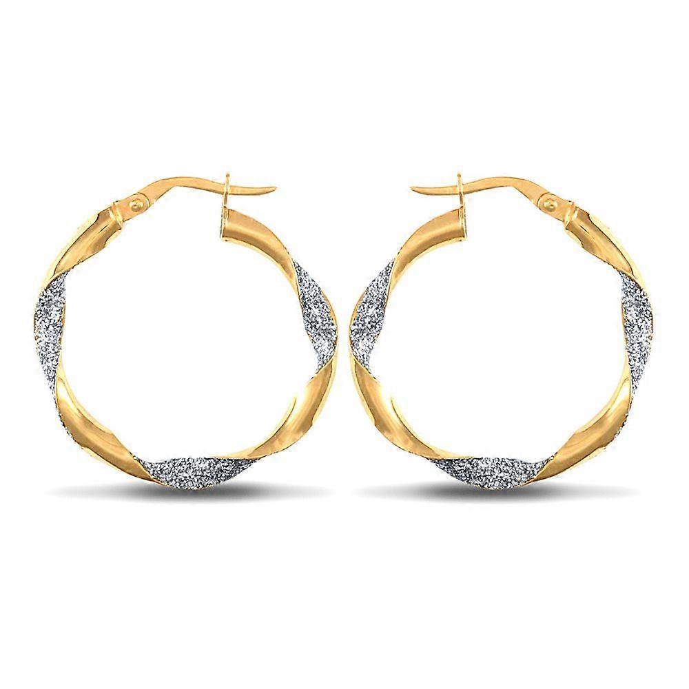 Jewelco London Ladies 9ct Yellow and White Gold Crushed Ice Glitter Twist 3mm Hoop Earrings 25mm
