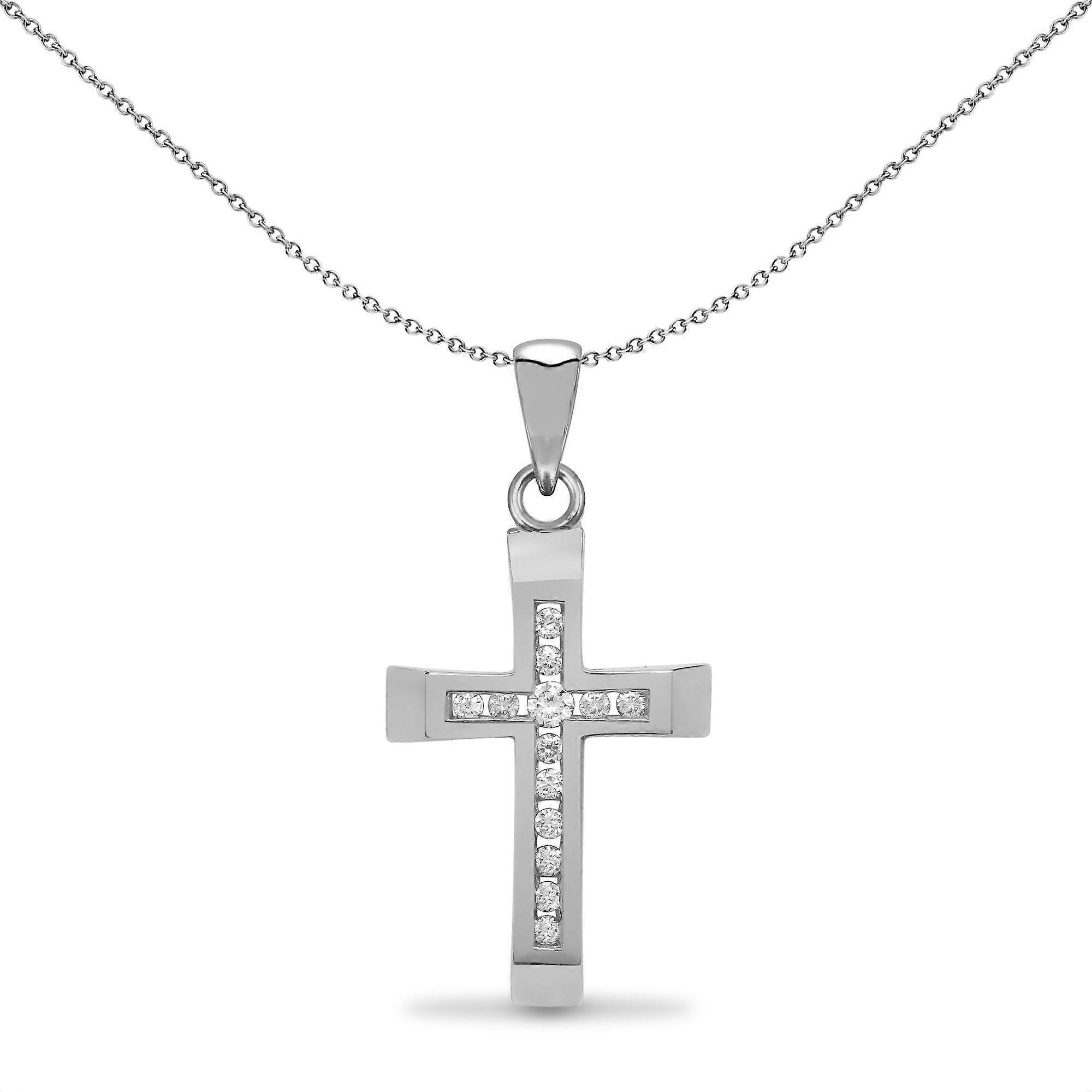 Jewelco London Ladies Solid 9ct White Gold Channel Set Round H I1 0.12ct Diamond Bevelled Cross Pendant