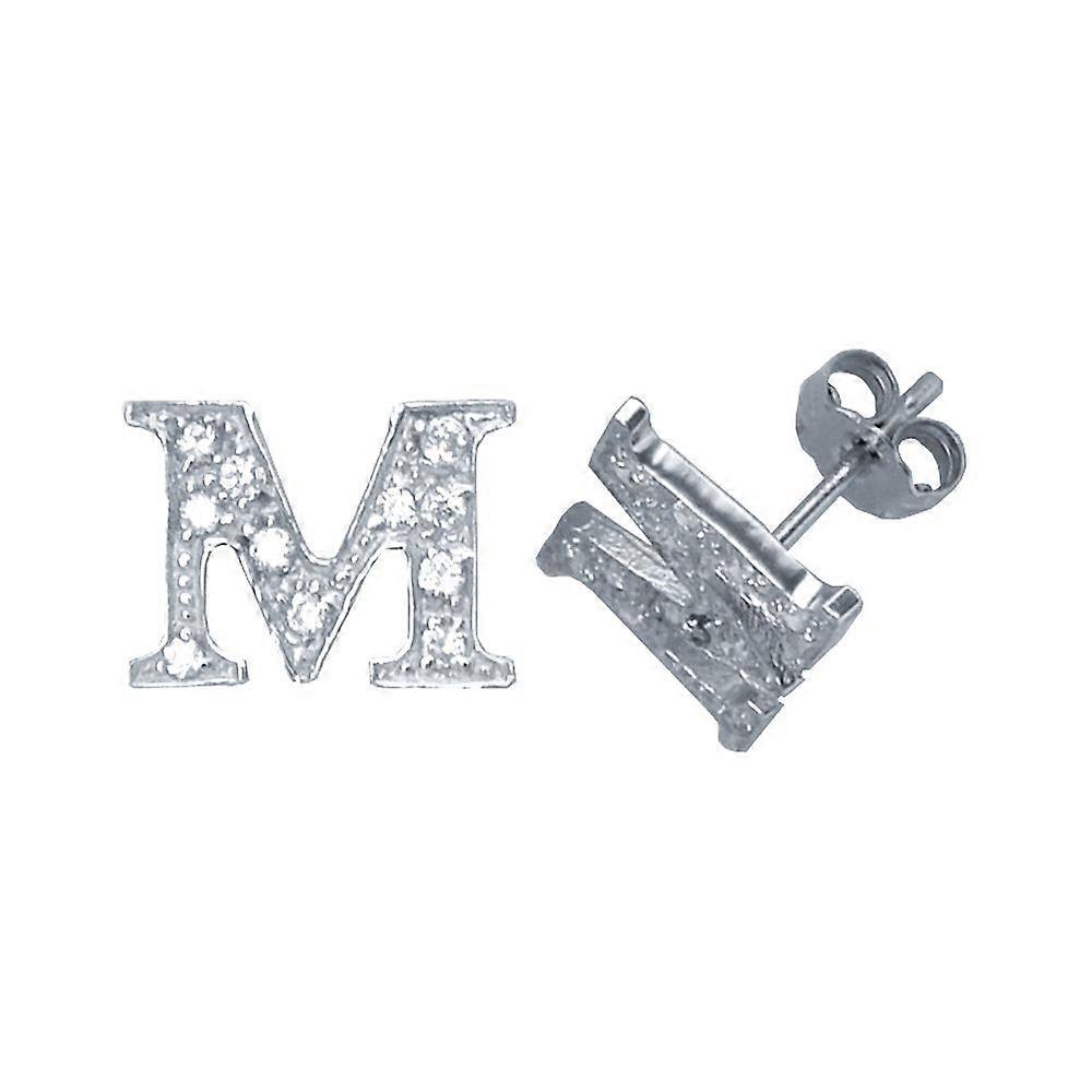 Jewelco London Rhodium Sterling Silver Initial Identity Stud Earrings Letter M