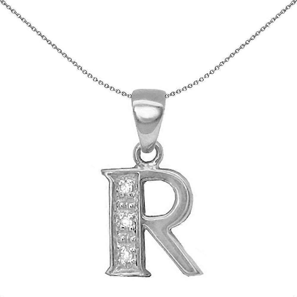 Jewelco London 9ct White Gold Pave Set Round H I2 0.02ct Diamond Identity Dainty Initial ID Charm Pendant Letter R