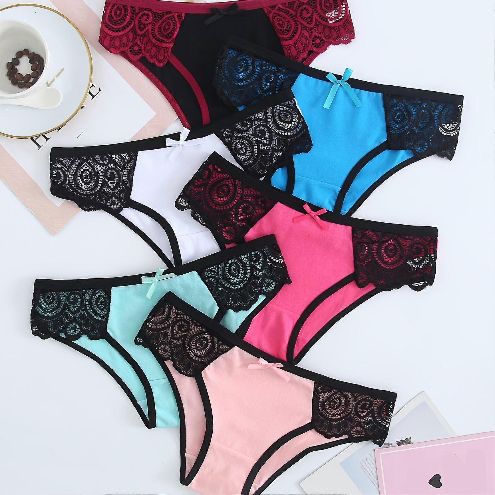 JUEGE* [6 Pack] Colorful Cotton Panties, Contrast Lace Soft & Stretchy Bikini Briefs, Women's Lingerie & Underwear
