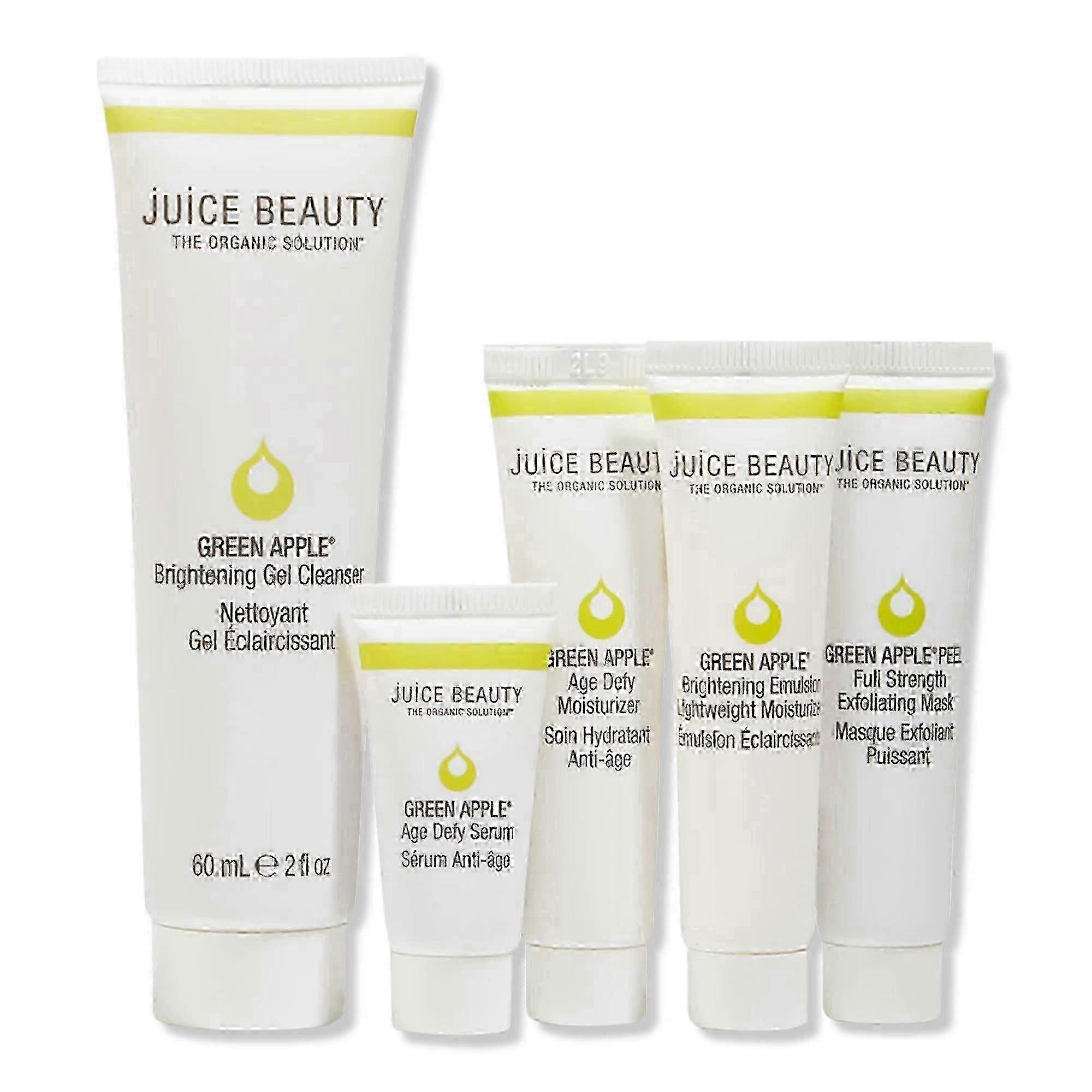 Create a brighter and smoother complexion with a complete Juice Beauty potent age-defy regimen of clinically proven Green Apple Brightening Solutions. Cleanse, treat, and hydrate.BenefitsHelps to visibly brighten with malic acid from organic green apples.Creates a smoother looking complexion with a powerful age-defying cocktail of alpha lipoic acid & CoQ10.Provides plumping moisture to skin with plant-derived hyaluronic acid.NOTE: Juice Beauty Green Apple Brightening Collection is not designed for very sensitive or rosacea skin.Vegan & Cruelty-Free.Formulated with an organic base of botanical juices instead of added water.Formulated Without ParabensPetroleumPropylene or Butylene GlycolsSiliconesTalcCarbon BlackPhthalatesSulfatesPEGsTEAsDEAsGMOsArtificial DyesSynthetic fragrancesIncludesGREEN APPLE Brightening Gel Cleanser (2 oz)GREEN APPLE Age Defy Moisturizer (0.5 oz)GREEN APPLE Peel Full Strength (0.5 oz)GREEN APPLE Brightening Emulsion Lightweight Moisturizer (0.5 oz)GREEN APPLE Age Defy Serum (0.25 oz)Inactive Ingredients: Complete ingredient listings can be found on individual product pages.Suggested Use: GREEN APPLE Brightening Gel Cleanser: Cleanse morning and evening by massaging onto face, neck and décolleté. Rinse well. GREEN APPLE Peel Full Strength: After cleansing with the Juice Beauty GREEN APPLE Brightening Gel Cleanser, in the evening, apply a generous layer to entire face, neck & décolleté, avoiding the eye area. Leave on for 10 minutes. (Flushing and tingling are normal.) Rinse well. GREEN APPLE Age Defy Serum: After cleansing with the Juice Beauty GREEN APPLE Brightening Gel Cleanser, apply over entire face, neck and décolleté before using GREEN APPLE Age Defy Moisturizer. GREEN APPLE Brightening Emulsion: Smooth over cleansed face, neck and décolleté, then massage into the skin until fully absorbed. Can also be layered under the GREEN APPLE Age Defy Moisturizer for maximum hydration and brightening benefits. GREEN APPLE Age Defy Moisturizer: After cleansing with the Juice Beauty GREEN APPLE Brightening Gel Cleanser and applying GREEN APPLE Age Defy Serum, massage this rich moisturizer into face, neck and décolleté. Use nightly.Expiration Date: We have fresh stock each week with exceptional expiration dates. Products will expire no later than six months to 2 years after receipt. If you require an exact expiration date or lot number, please contact us before making a purchase.Product Packaging: Please note that some manufacturer may often change their packaging. This product may arrive different from what is pictured. We will always ship the most up-to-date packaging to our customers. Please contact us if you have any questions about this product or would like to request an older version of this product.Healthcare Disclaimer: Content on this site is for reference purposes only. OTC Shoppe Express does not represent or warrant that the nutrition, ingredient, allergen and other product information on our Web or Mobile sites are accurate or complete, since this information comes from the product manufacturers. On occasion, manufacturers may improve or change their product formulas and update their labels. We recommend that you do not rely solely on the information presented on our Web or Mobile sites and that you review the product's label or contact the manufacturer directly if you have specific product concerns or questions.