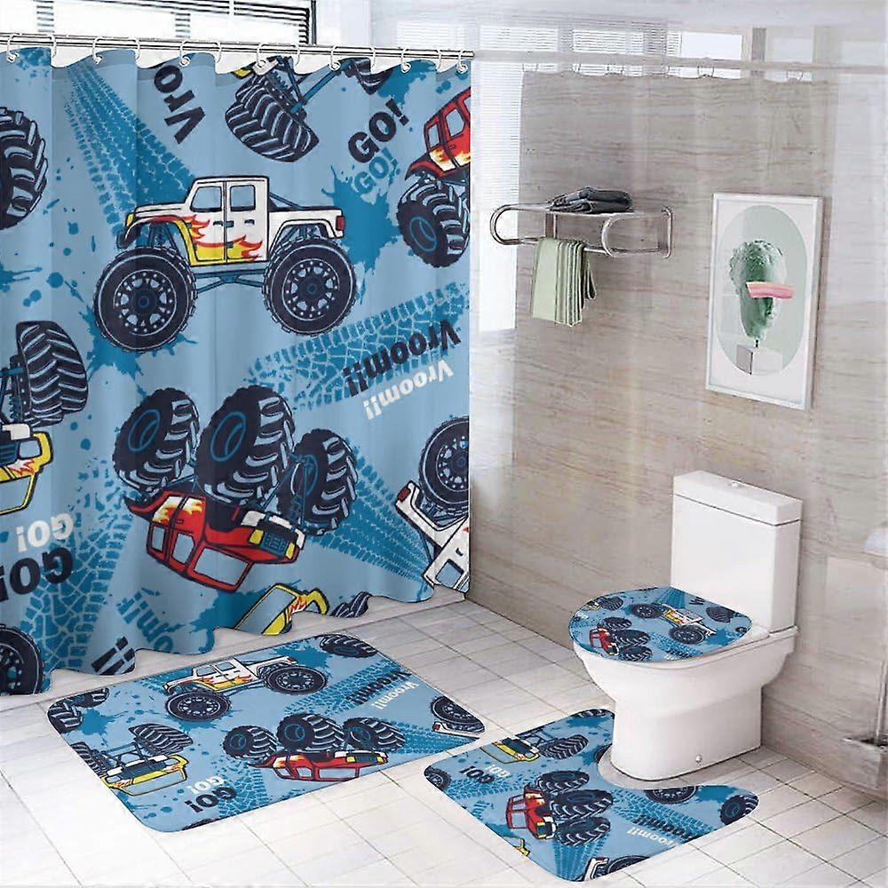 Shower Curtain Sets with Rugs 4 Pieces Monster Truck Cars Boys Blue Bathroom Accessories Waterproof Non-Slip Mat 72 x 72 Inch