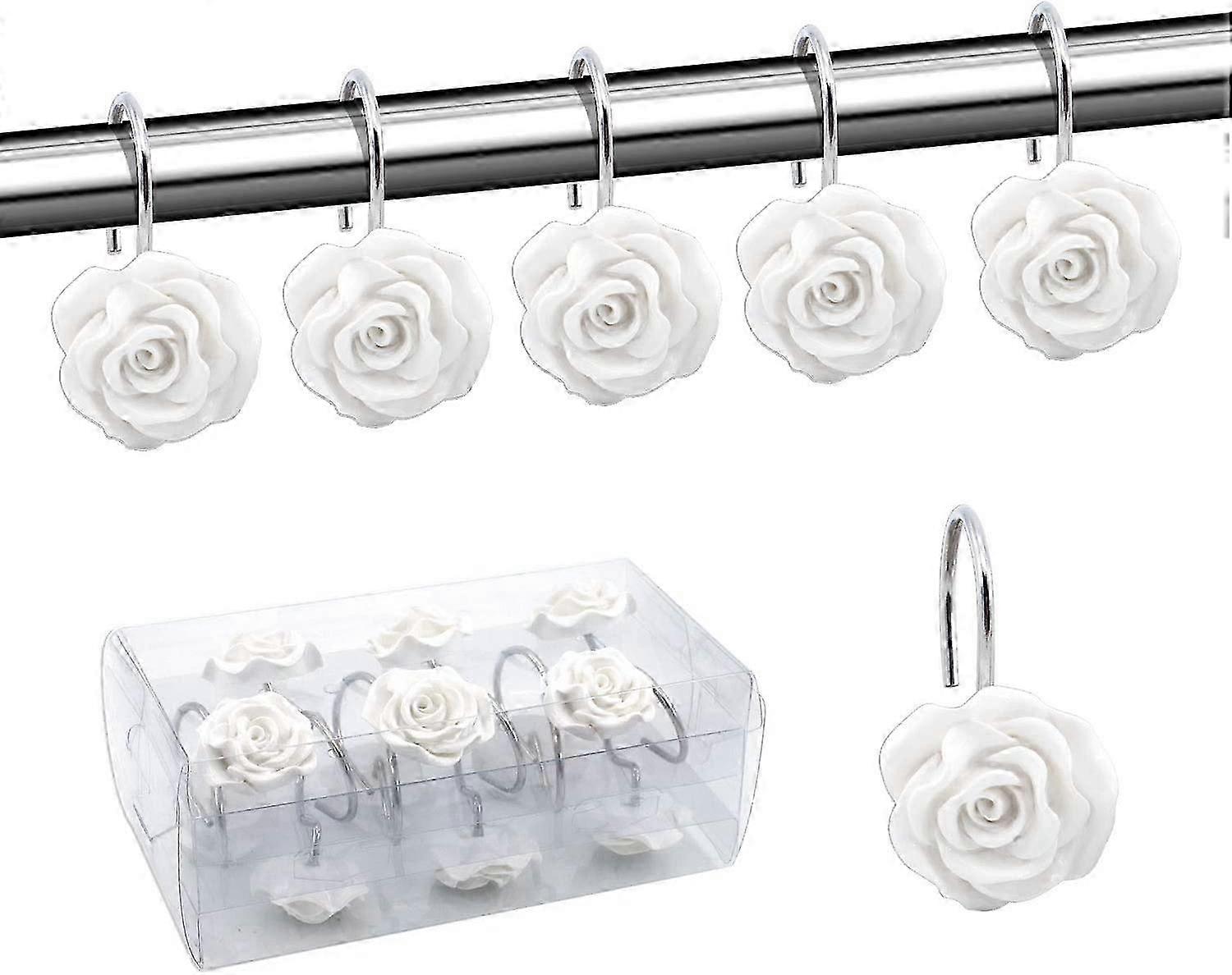 color: White Material Resin Number of pieces 12 Made of high quality rust-resistant stainless steel hook and resin rose design Stylish Home Decor Rose Hooks for Bathroom, Living Room, Bedroom, Kid's Room, Baby Room Pair them with your favorite curtains and curtain liners for added privacy and moisture protection, or to make your drapes even more attractive! Compatible with 22-30mm (0.8"-1.1") diameter rods, they are easy to install and coordinate with popular bathroom hardware finishes. Simply attach the shower curtain hook securely to the straight or curved shower curtain rod by hand. Package includes: a set of 12 rose shower hooks