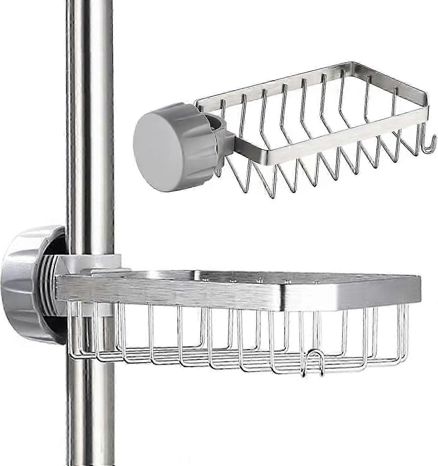 Beautiful and durableThe shower soap dish has a stylish design and comes with a hookMade of high quality SUS304 stainless steel The welds are smooth and beautifully integrated into your bathroom. Shower Caddy No DrillNo drilling or glue, just screw it onto the shower riser rail or Kitchen Faucet and it will offer strong load-bearing. It has a wide range of applications and can be secured anywhere there is a pole, such as RV sinks, bathrooms, etc. Adjustable & Removablethe shelves installed can be rotated and adjustable in 360 degree and you can change easily its position as your want or remove it. No drilling or tools is required.