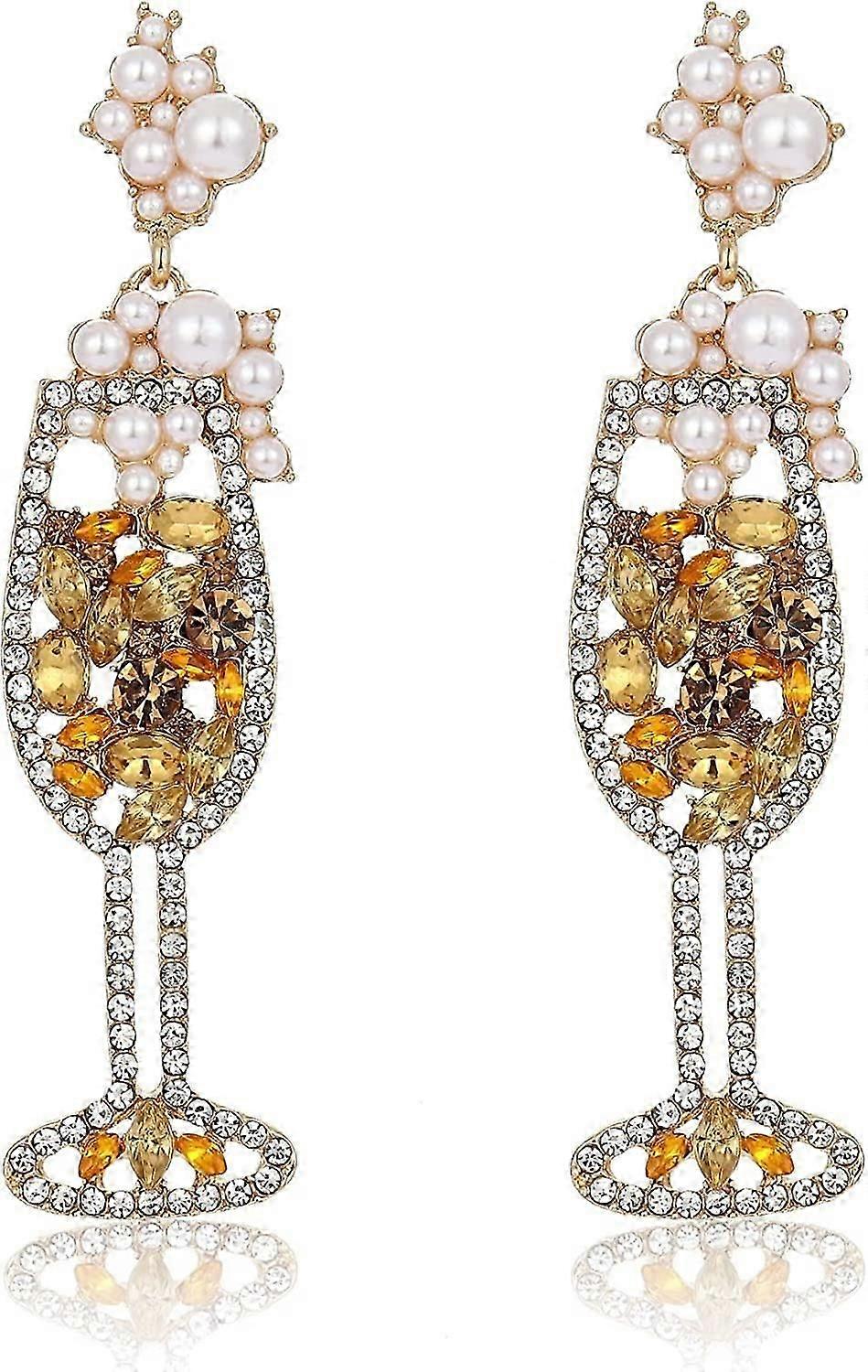 Champagne Bottle Earrings, Handmade Crystal Champagne Wine Glass Earrings Rhinestone Beaded Pearl Drop Dangle Earrings Charming Cute Statement Party E