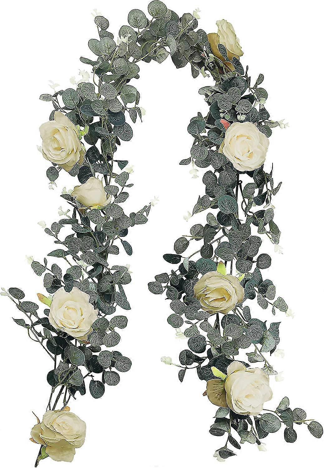 Artificial Eucalyptus Garland With Champagne Roses Ivy Greenery Leaf Garland Plants Vine Foliage Flowers Hanging For Wedding Party Garden Home Wall De