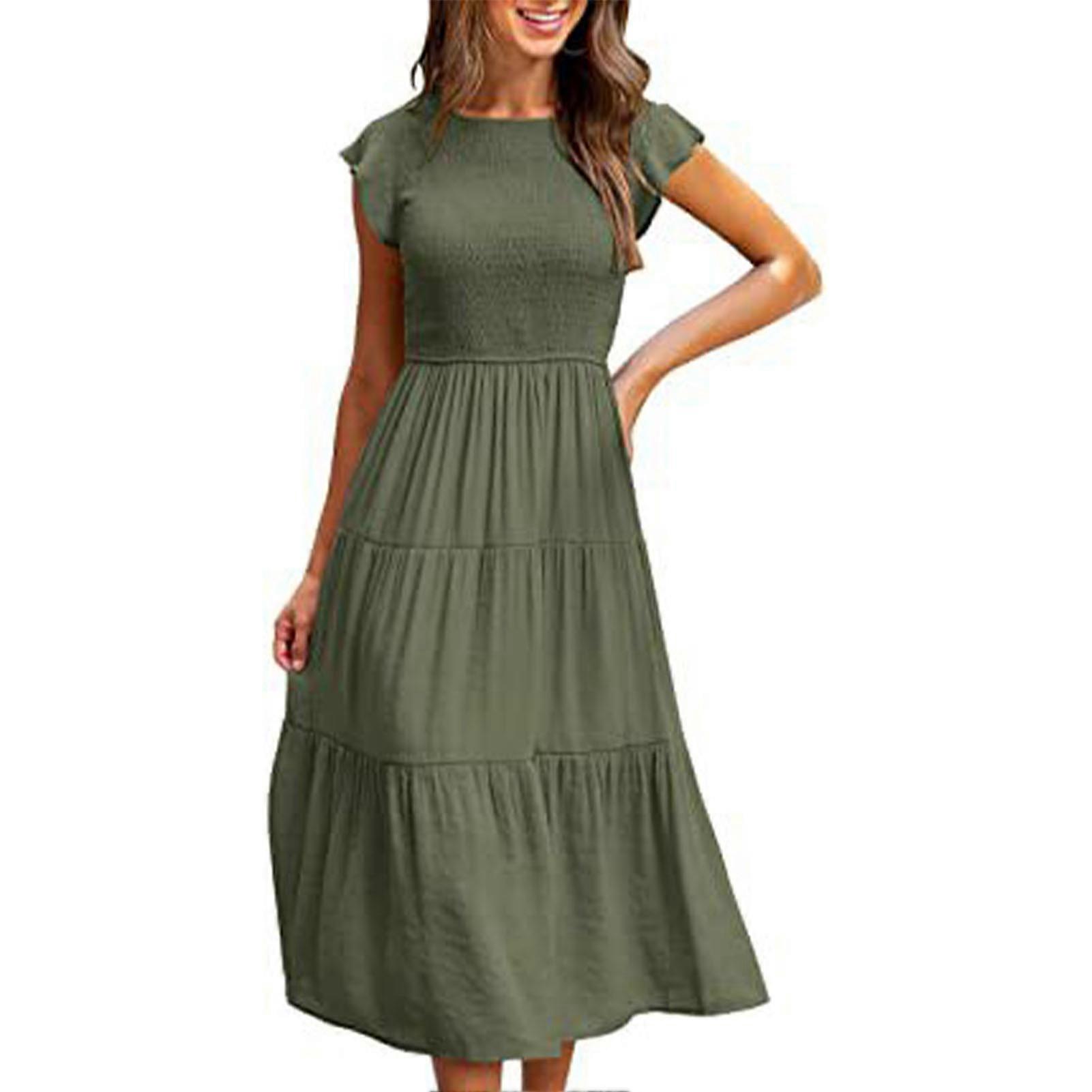 Shirred Tiered Short Sleeved Dress Women Casual Back Button Crewneck Ruffle Sleeve A Line Dress OD Green S