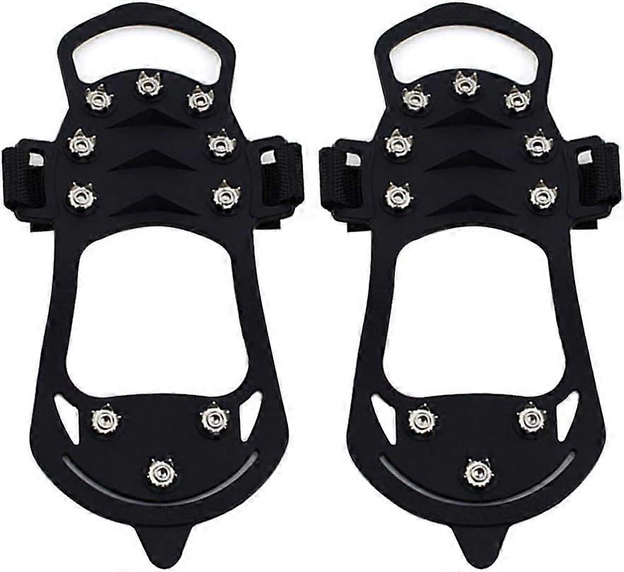 COLD AND HEAT RESISTANT: the ice cleats can work in a wide range of temperature, it maintains flexible form -40 up to 230 degrees Celsius EASY TO SLIP ON: simply slip-on around your footwear in seconds; Just pull the tab over your heel for a snug fit on your shoes; do not need additional buckles or straps to wear the crampons SAFE: the spikes caps are not easy to loose off from the ice crampons, ensures that your shoes are firmly gripped on ice to reduce the risk of hurt from falls or slips MATERIAL: durable, lightweight rubber and plastic mixed construction with tough metal cleats FIT ALL SHOES: the ice crampons fit for women, men,eldly and kids, suitable for all kinds of outdoor shoes, such as hiking shoes, sports shoes, casual shoes, boots, dress shoes etc The crampons are lightweight and can be folded or rolled up to be carried in a purse, work-bag, or even your pocket, so you are ready for the worst of winter. Particularly suitable for the elderly and children in snow and ice road. It can be a warmgift for your family in winter or slippery season. These ice cleats maintain enough traction and durability in all outdoor activities in winter, such as ice fishing, skiing, walking, jogging, hiking etc.