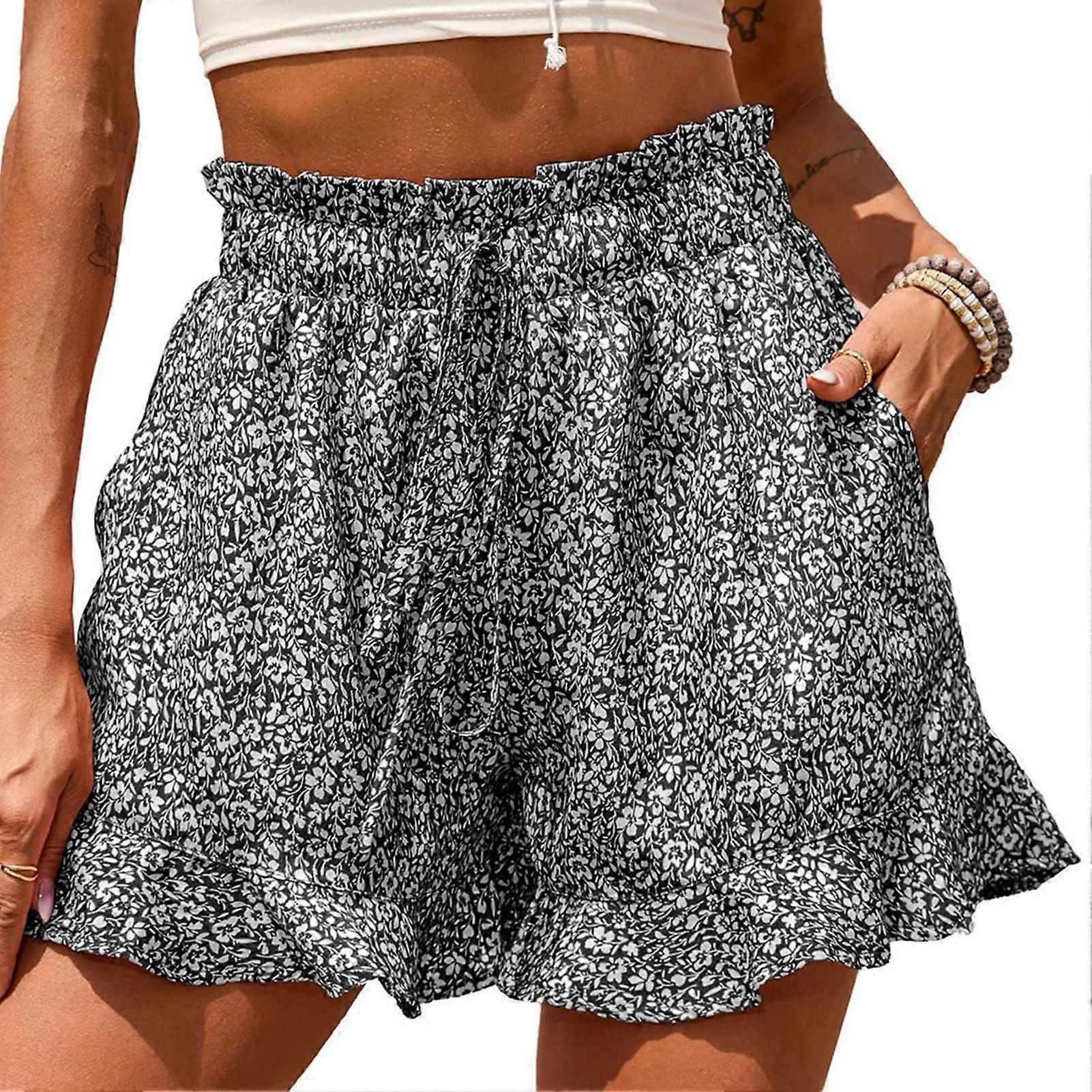 Shorts Summer Fashionable Print Loose Casual High Waist Belt Pocket Shorts for Ladies Grey L