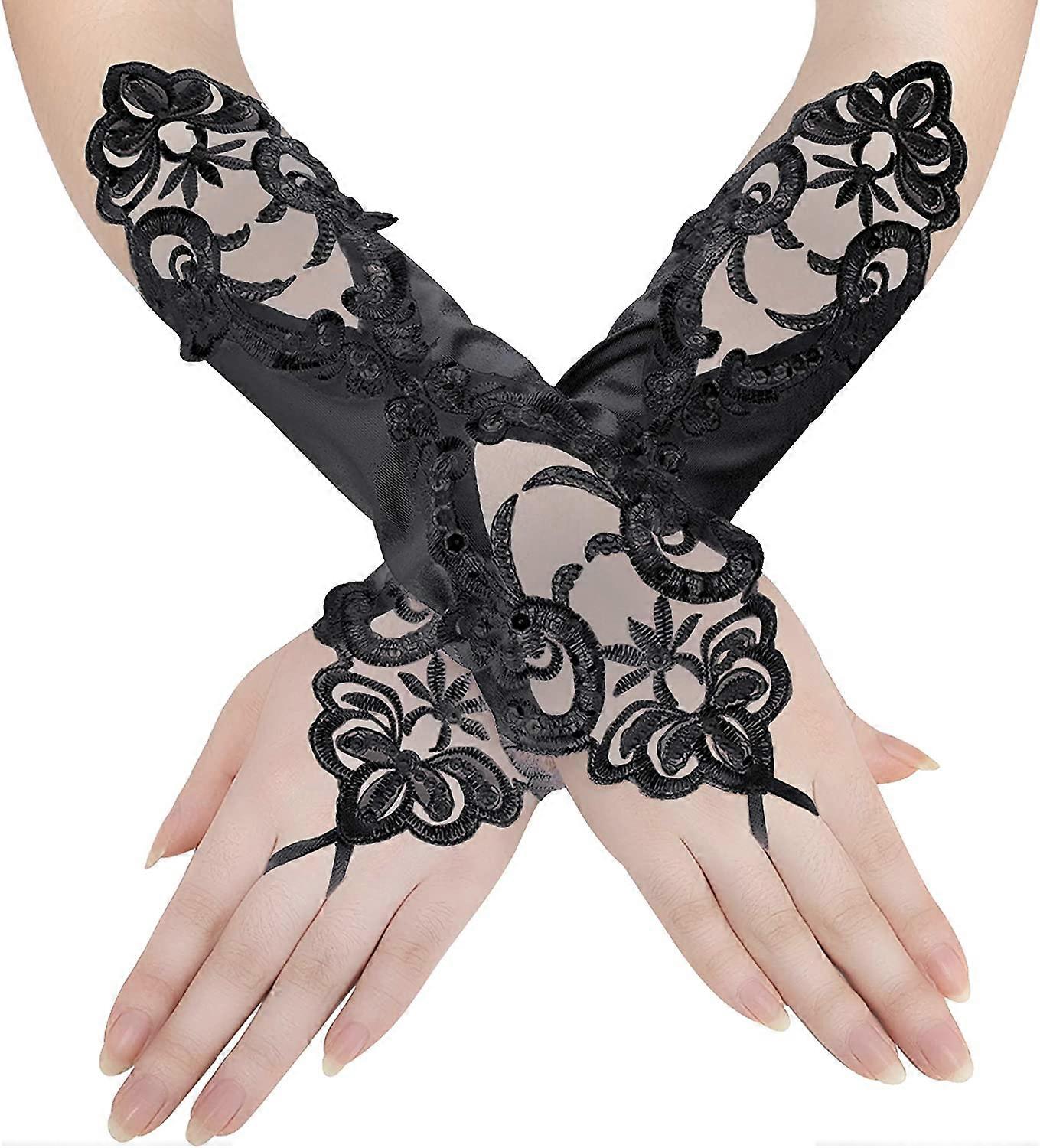 Short Opera Party 20s Satin Gloves Stretchy Adult Size Tea Party Wedding Lace Gloves 11.8" Black -