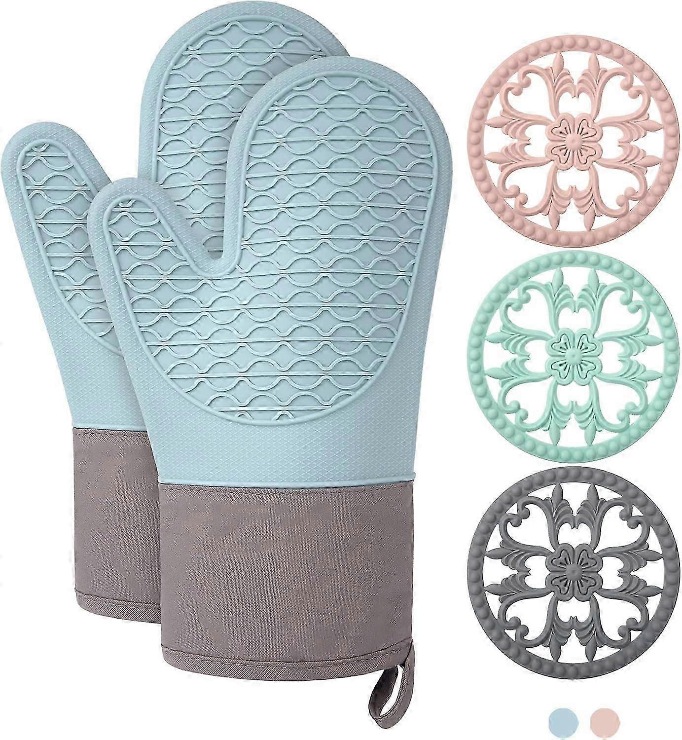 Silicone Oven Mitts Heat Resistant, Oven Mitts and Pot Holders Sets, Kitchen Mittens 5 Piece Set, Oven Gloves for Cooking,Baking,BBQ, Blue Oven Mitts