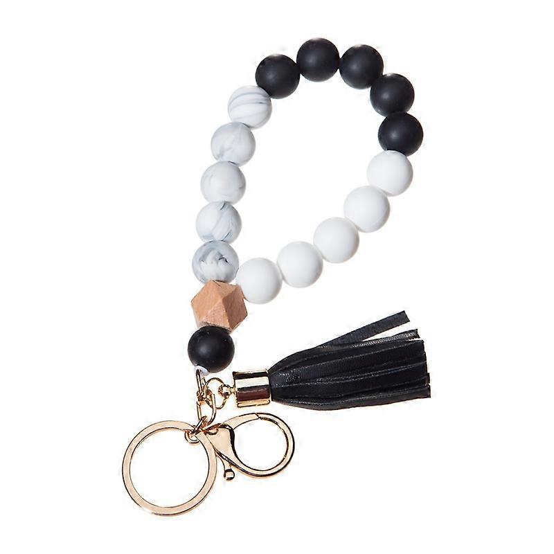 Silicone Key Ring Bracelet Wristlet Keychain Unique Beaded Bangle Key Chains with Leather Tassel Anti-lost key ring(black)
