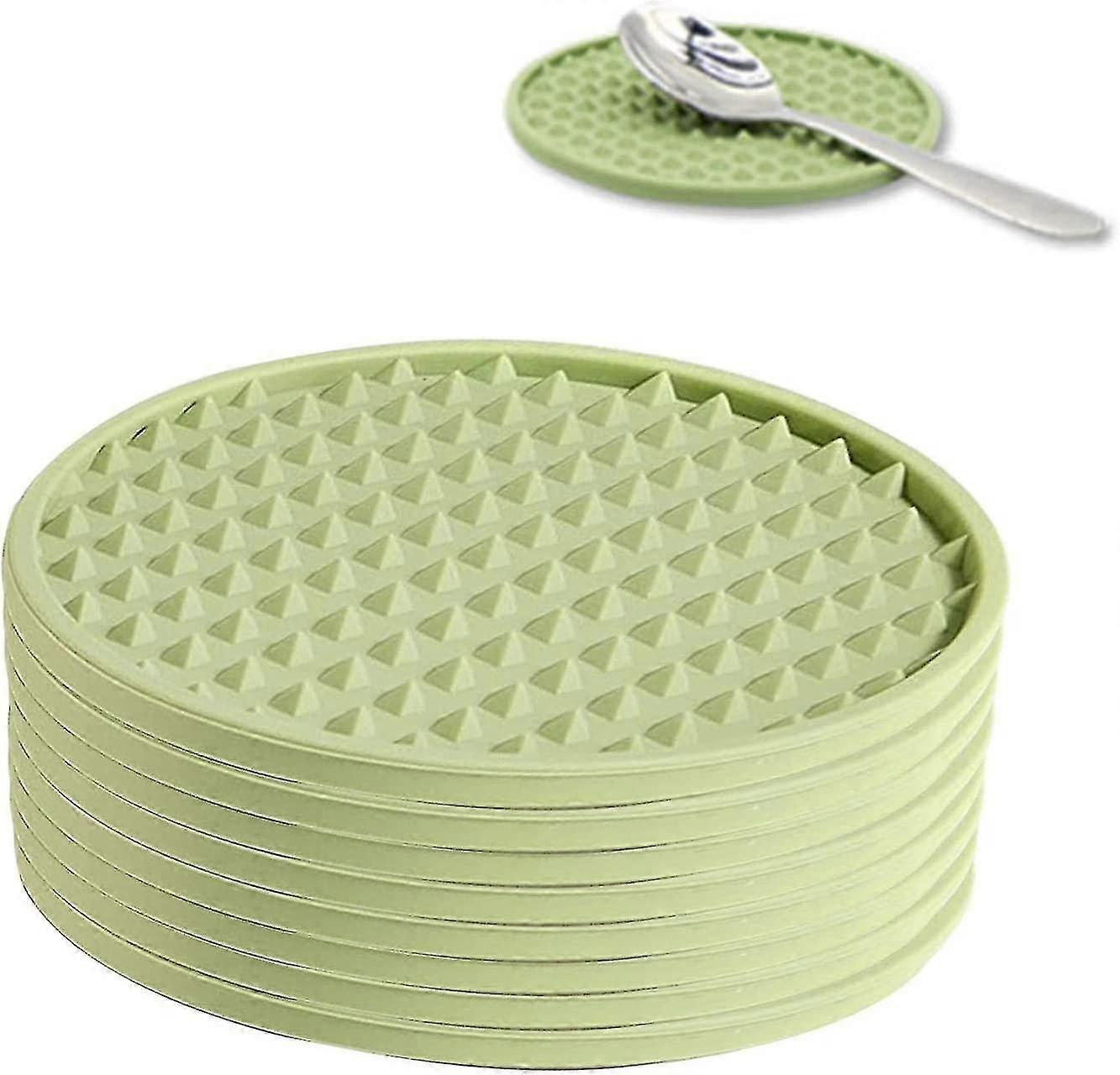 Protection: The indoor and outdoor cup coasters can be used on any materials table type, like wood, granite, glass, soapstone, sandstone, marble, stone tables, and so on. Smart protect the of your kitchen counter tabletop, office desk, or bedside furniture from nasty marks or scary scratches.Doublesided design: The coaster is made of foodgrade silicone, nonslip, antisticking, and high temperature resistant. Suitable for a variety of beverages (both hot and cold)Multifunctional use: Our cup coasters can be used as small tripods, pot racks, spoon racks, kitchen table mats, and furniture foot cups for home tables and chairs and bar tableware sets. Soft coasters are suitable for kitchens, bedrooms, bathrooms, parties, libraries, restaurants, offices, bars, etc.Great choice: Gorgeous dining table cup coasters never go out of style and make the perfect gift for an enthusiastic host, a friend's housewarming, or a wedding. Impressive.Contain: You can get an iron stand and 8 10x0.5cm nonslip, waterproof drink coasters, suit for all types of cups, which perfectly meet the needs of the family and are your best choice.