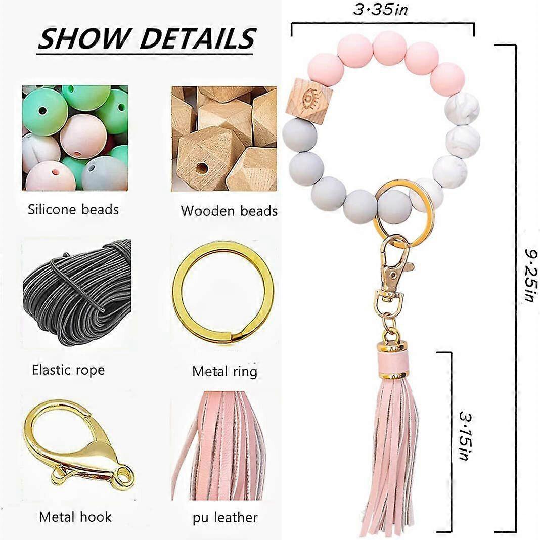 Silicone Beaded Key Ring Bracelet ,Keychain for Women,Portable Car Tassel Key Rings Holder Wristlet Bangle Chains - Pink