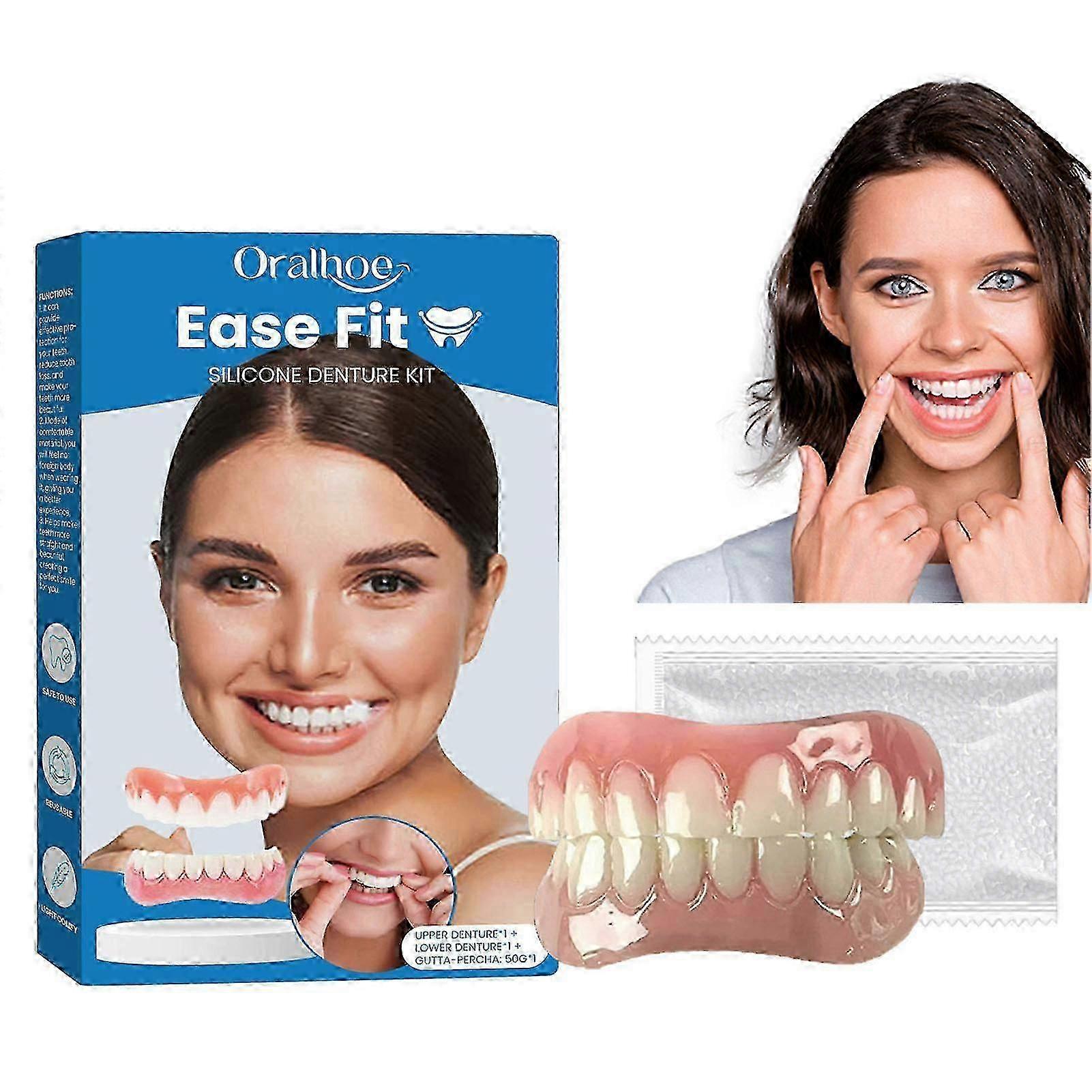 Features: Comfortable and Secure Fit: Our Silicone Reline Denture Set ensures a comfortable and secure fit for your dentures, provi-day comfort and confidence. Say goodbye to loose or ill-fitting dentures!. Easy-to-Use Reline Kit: Our Silicone Reline Kit for Dentures is designed for easy application, allowing you to reline your dentures at home without the need for a costly dental visit. Save time and money while maintaining a perfect fit. Universal and Unisex Design: Our Unisex Soft Denture Reline Kit is suitable for both men and women, making it a versatile option for anyone seeking a comfortable and customized denture experience. It caters to a wide range of denture wearers. Natural-Looking and Versatile: The Comfort Fit Dentures Teeth Set provides a natural-looking smile that enhances your appearance. Whether you want to hide missing, crooked, stained, or broken teeth, our dentures offer a cosmetic solution that protects your teeth. Whitening and Simulation Braces: Our Perfect Smile Teeth Veneers feature whitening dentures simulation braces, allowing you to achieve a brighter and more radiant smile. Enhance your confidence and protect your teeth with this cosmetic solution. Specification: Material: Silicone Teeth Size: 5.51.5cm,61.3cm Include: 1Reline Denture Set