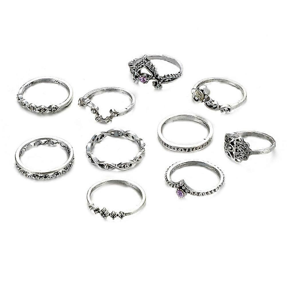Purple Rhinestone Ring Set For Women And Girls Featuring Crown Shape Vintage Design In Silver Color 10Pcs