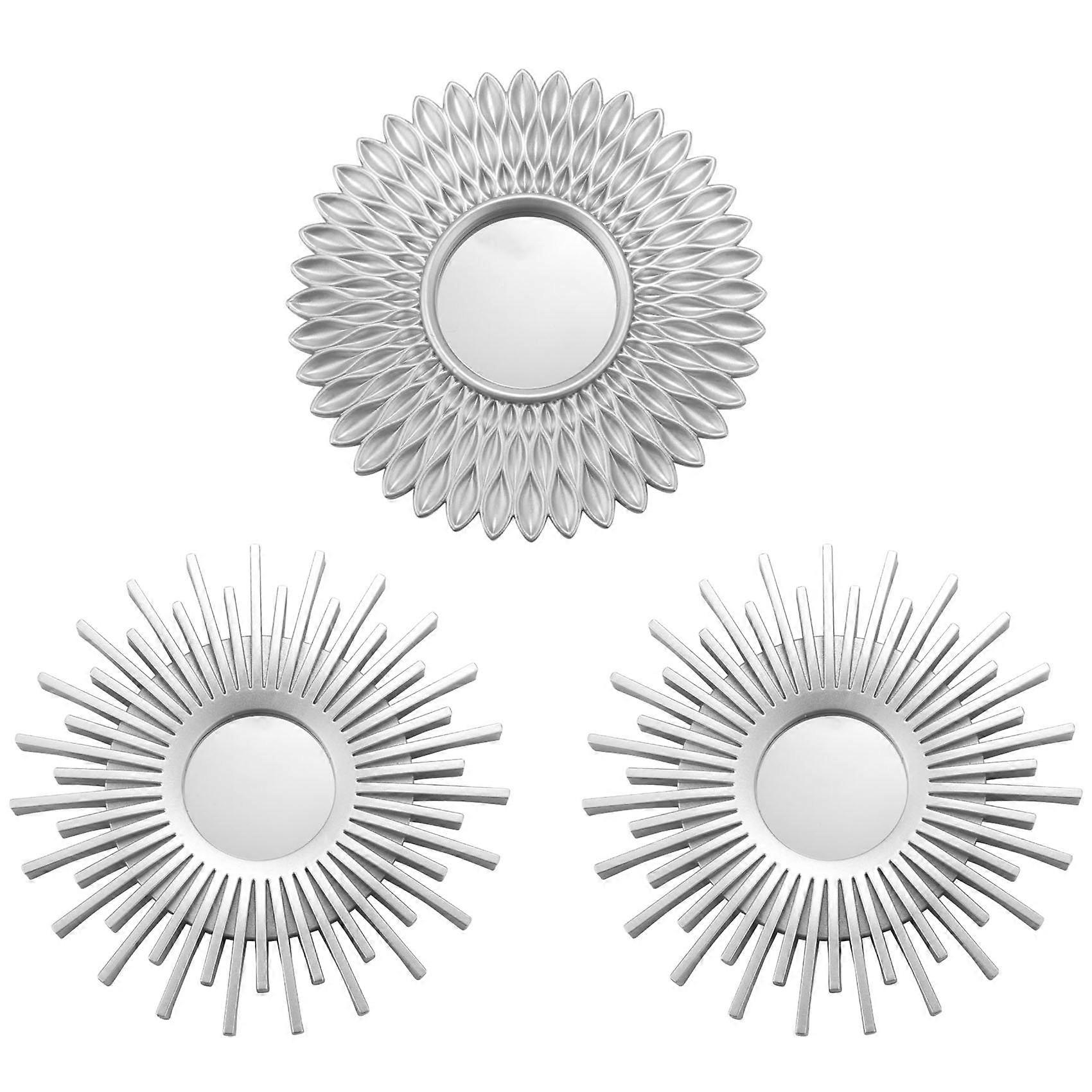 PACK OF 3 The for wall decor come in of 3, allowing you to use each small round mirror to decorate several rooms if you wish, or put all on the same wall to give a unique and style. They are perfect wall decor for living room, bedroom, hallway, lounge and office These decorative gold measure 9.84x9.84x0.63 inch WALL-MOUNTED PLASTIC LIGHT Each of the three hanging has a small eyehole so they can be hung on a wall. The plastic frame is resilient and helps to protect the circle mirror so it is more durable VINTAGE DECORATION Give a shabby chic Press to your home with this circle vintage mirror set. In addition, they also combine with other decoration styles such as Scandinavian, Boho, Minimalist or Classic. They are perfect as ornaments and home accessories for and for decorating anywhere ORIGINAL GIFT These are perfect as a because they come in a beautiful package that is perfect for being gifted. Original gifts for women on birthdays, Christmas, 's Day and for Mother's Day. your , grandmother, girlfriend or mom with this great gift Two different types of , two in the shape of sunrays with a more rounded finish. Each mirror includes a small eyebolt to easy to hang . Plastic frame, sturdy material. COLOR: Silver Material: PVC+lens Package Contents: 3 x Decorative mirror Only the above package content, other products are not included. Note: Light and different displays may cause the color of the item in the picture a little different from the real thing. The measurement allowed error is +/- 1-3cm.