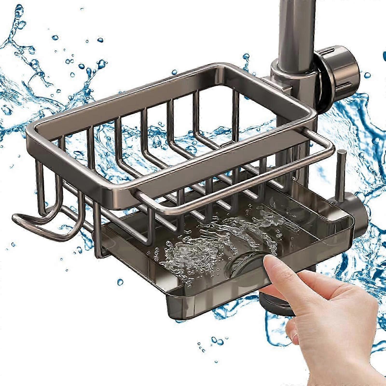 Larger Capacity & Easy InstallThis kitchen sink faucet rack offers easy installation without drilling or glue, providing a larger capacity with extended dimensions. Perfect for storing sponges, dish soap, and brushes. Rustproof & Durable MaterialMade of waterproof and rustproof space aluminum, this sink holder is solid, firm, and has a strong load-bearing capacity. It helps you organize and dry everyday items quickly. Faster DryingThe strip-shaped hole design of the sink organizer enhances drainage, keeping the surface dry. The drip tray prevents water stains in the sink, ensuring faster drying. Save Space & Hook DesignSized perfectly for pads, brushes, and soaps, this accessory also features a hook to hang towels or brushes, maximizing space utilization in your kitchen. Versatile UsageWhile ideal for the kitchen, this sponge holder can be used in bedrooms, bathrooms, and garages, providing storage for cleaning tools and other essentials.