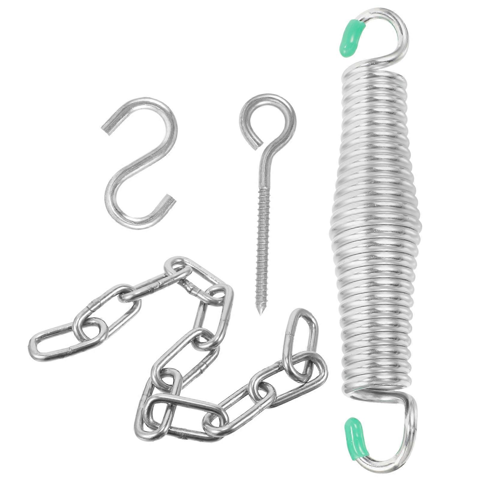This is a swing spring accessories set. The spring is manufactured with sturdy material, which is durable and practical. They are perfect for hammock chairs, porch swings, swinging chairs, punching bags, or hanging any other heavy object from an overhead mount. Features -Color:Silver -Material:Galvanized iron -Size:22.00X4.50X4.50cm/8.65X1.77X1.77in -Spring for mounting hammock chairs and other hanging accessories like punching bags, hanging plants, etc. -Securely to suspend your swinging chair, let you rotate and twists without tangling or having to untwist. -Sturdy galvanized iron construction, industrial long spring coil, perfect for all your bag needs. -Low noise, stress and vibration. An essential gadget for outdoor supply. -It is manufactured with professional technology to ensure the of the product and can work for a long time. Package list: 1 x Spring 1 x Claw Screw 1 Hook 1 x Chain