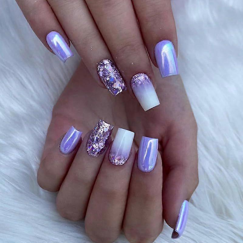Square Ombre White Purple Press On Nails Short Medium Fake Nails Glitter Stick On Nails Fa
