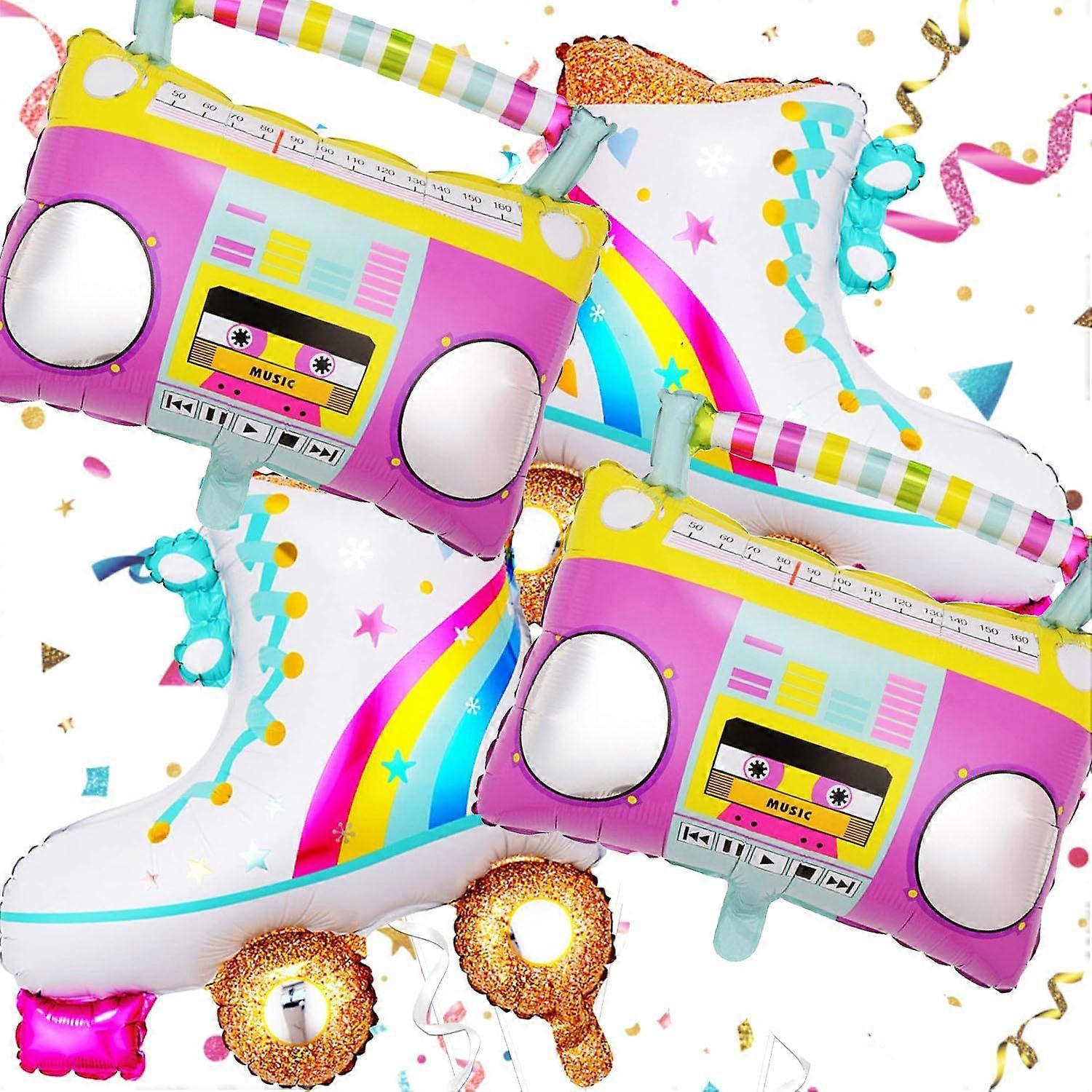 Main Features and Advantages - Feature 1: These party balloons feature a unique design with a skate shoe and radio shapes. The radio balloon showcases classic buttons and cassette player patterns, while the skate shoe balloon is adorned with colorful rainbows and stars, complete with shiny golden wheels that create a stunning visual impact! - Feature 2: This vibrant balloon set is an essential part of any retro-themed party. The eye-catching radio speaker and roller skate balloons are sure to be a hit, impressing your family and friends and creating a memorable atmosphere for your celebration. - Feature 3: Made from high-quality aluminum foil, these balloons boast uniform colors and durability. They are reusable and self-sealing, allowing you to deflate them using the provided straw and store them for future events, ensuring youre always ready for the next party! - Feature 4: Perfect for decorating 80s and 90s themed parties, birthday celebrations, karaoke nights, rock parties, disco events, and hip-hop gatherings. Additionally, they are great for graduation parties or music-themed events, adding a fun and unforgettable touch to any occasion. - Feature 5: With their playful designs and vibrant colors, these balloons are not only decorative but also serve as excellent conversation starters, enhancing the festive spirit of your event and making it truly unforgettable.Technical Specifications - Product Name: Skate Shoe and Radio Aluminum Foil Balloon Set - Product Size: Skate: 64x52 cm (25.2x20.5 in), Radio: 55x59 cm (21.7x23.2 in) - Product Material: Made from aluminum foil - Product Color: Multi-colored Solutions The Skate Shoe and Radio Aluminum Foil Balloon Set provides a fun and engaging solution for enhancing the atmosphere of retro-themed parties. Their unique designs and vibrant colors create a lively environment that keeps guests entertained and adds a nostalgic flair to celebrations.Uses These balloons are perfect for a variety of occasions, including retro-themed parties, birthday celebrations, karaoke nights, rock and disco parties, and hip-hop events. They can also be used for graduation celebrations or any music-themed gatherings, making them a versatile choice for adding excitement to your events.Packaging List - 2 x Skate Shoe Balloons - 2 x Radio Balloons Please note: . Due to manual measurement, there may be a slight error in size. . Colors may vary slightly due to different display settings.