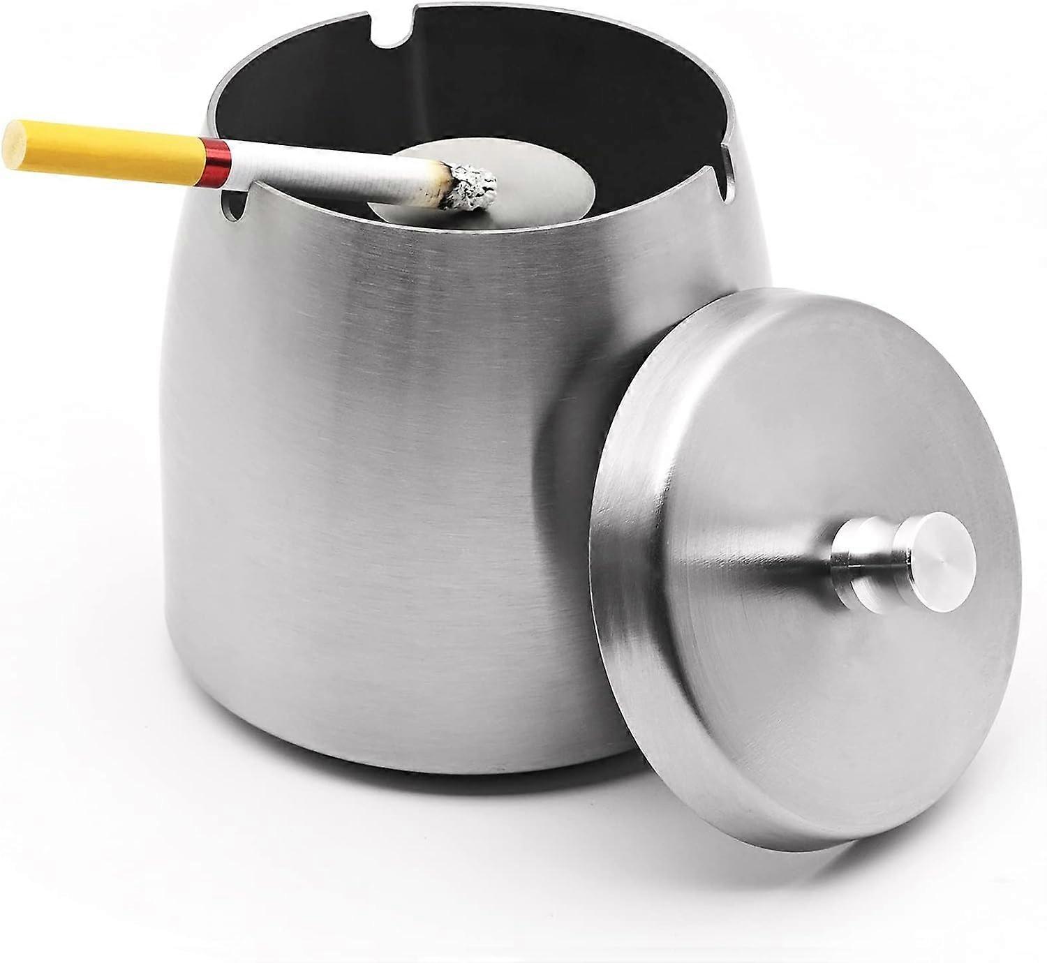 Premium Thickened Stainless Steel: The ashtray with lid is made from brushed stainless steel, it is rust-free, waterproof and odor-proof, its extra wide base is gentle on all surfaces, its surface with a fine polishing process, clean and tidy, no scratching hands. Don't worry, the design also prevents children from reaching into the ashtray. The perfect outdoor ashtray. 3 Recesses and 1 Central Column: The windproof ashtray has 3 U-shaped recesses and 1 removable column holder in the middle, it can hold the cigarette and extinguishes stubs, the recesses for the cigarettes are designed so that cigarettes cannot fall out. The low center of gravity of the ashtray makes it stable and secure on all surfaces. The lid reduces odor pollution for non-smokers. A Great Device for Smokers: This ashtray is made of solid stainless steel (Black), with anti-slip and anti-scratch stick pad so that the ashtray does not slip and scratch the tabletop. Due to the weight and the rubber base, the ashtray offers excellent stability, easy to use & clean. Size & Design: 8.7 8.7 7.4 cm, the center column design help put out the cigarette. Easy to belong and clean, unscrew the spindle and rinse it out from under the faucet insert more as well, and takes up very little space.