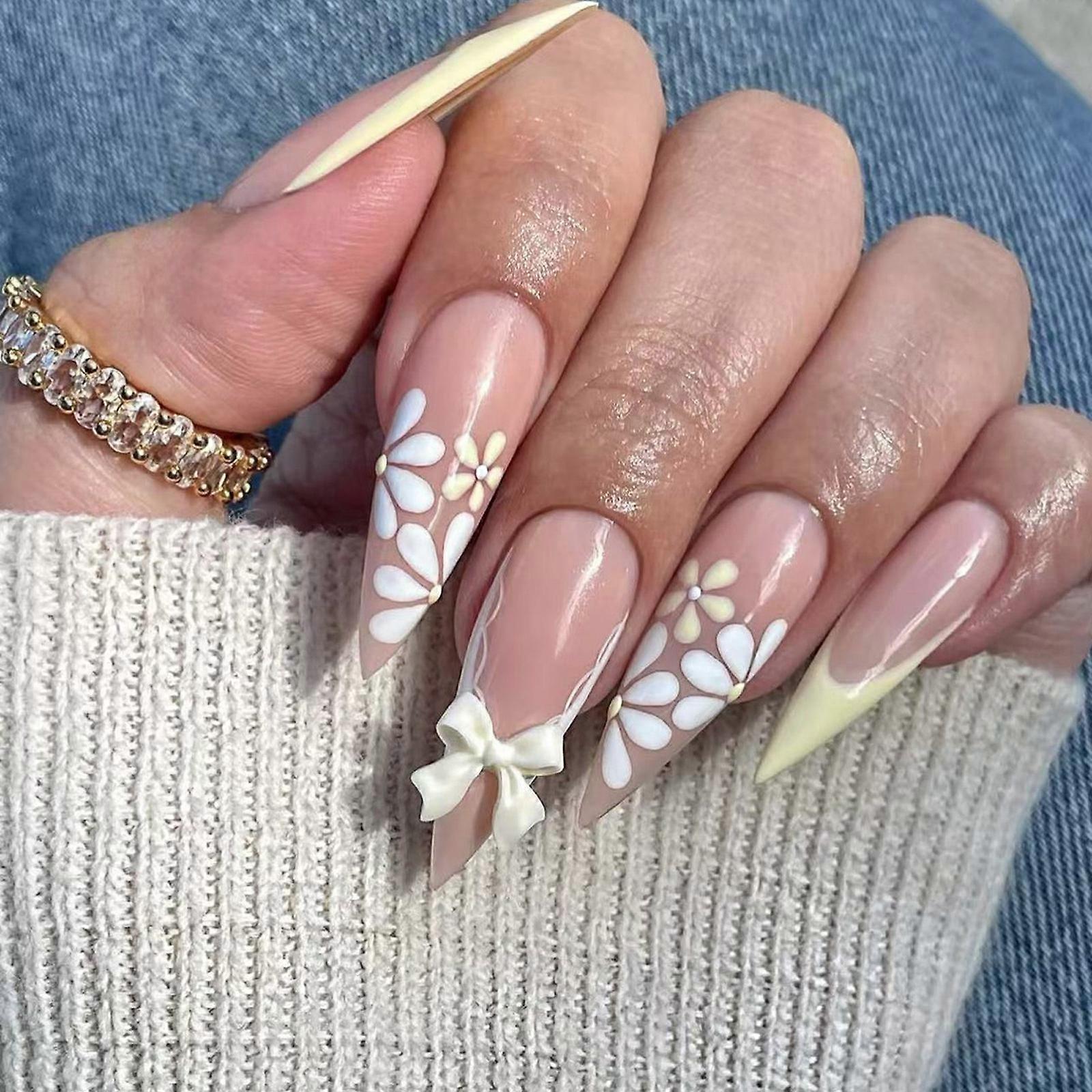 Stylish Long Pointed Artificial Nail French Style Press on Nail With Flower And Bows Detail Nail Art Decoration 24pcs