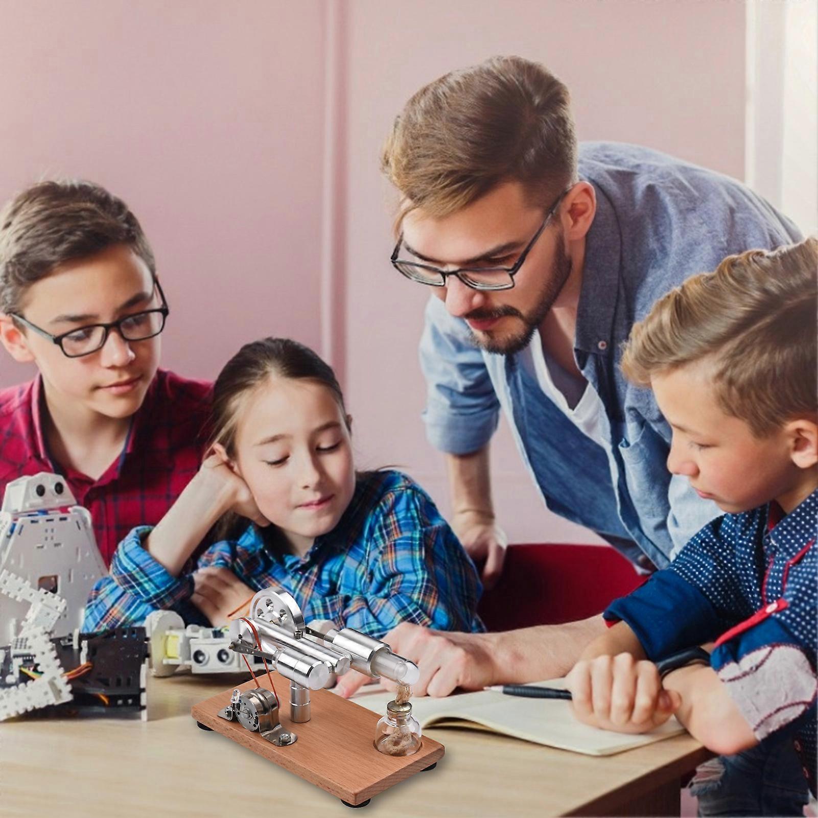 Stirling Engine Kit Electricity Generator Hot Air Motor Model with LED Light Flywheel Design Science Experiment with Wooden Base DIY Education Toy