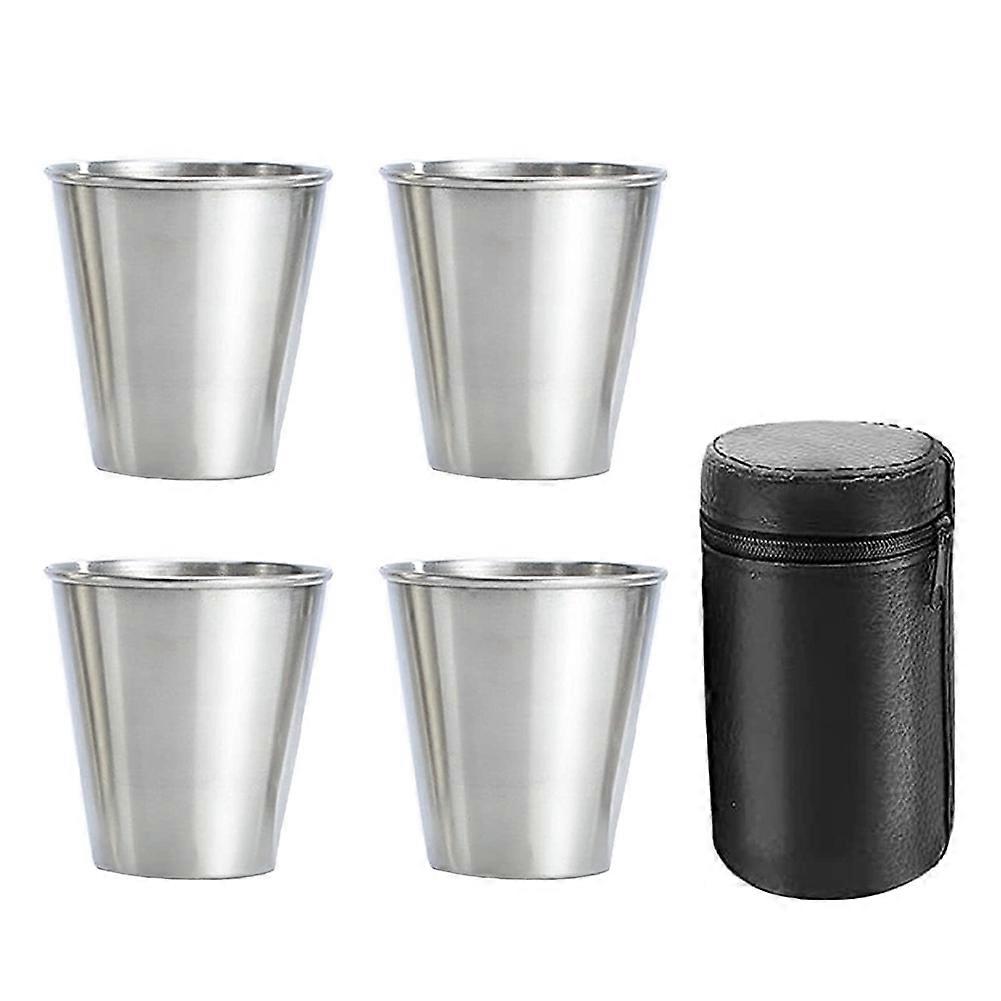 Stainless Steel Shot Cups, Set of 4 Cups, Metal Shot Glasses, Stackable, Hip Flask Small with Leather Bag for Outdoor