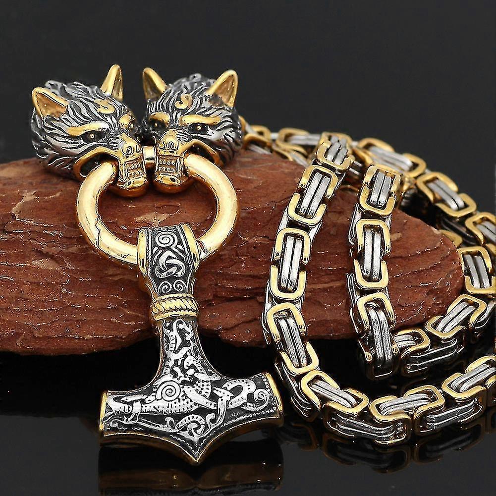 Stainless Steel Viking Wolf Head Doubles Color Thor S Hammer Pendant Leather Chain Men S Necklace Jewelry