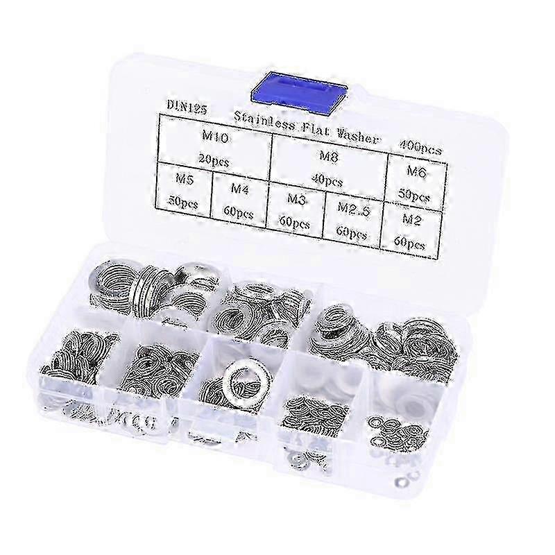 400pcs Stainless Steel Washers This kit contains flat washers. Great kit for the home or automotive. Washers are used with nuts and bolts and provide a greater bearing surface to prevent the nut or bolt head tearing through the fastened material. Lock washers resist loosening through vibration . Feature - Color: Silver - Material: Stainless steel - Package Size: 12.5x6.5x2.5cm - Assortment of quality washers for home, automotive, and shop use - Stainless steel with rust resistant galvanized finish to ensure long time use - Includes organizing case to store tools without risk of loss and damage - Suitable for mounting electronics, machinery, car models, model aircraft and other supplies Warm Tip: Dear buyer, Due to lighting effect, monitor's brightness, manual measurement and etc, there could be some slight differences in the color and size between the photo and the actual item. Sincerely hope that you can understand Thank you Note: Due to the light and screen setting difference, the item's color may be slightly different from the pictures. Please allow slight dimension difference due to different manual measurement.