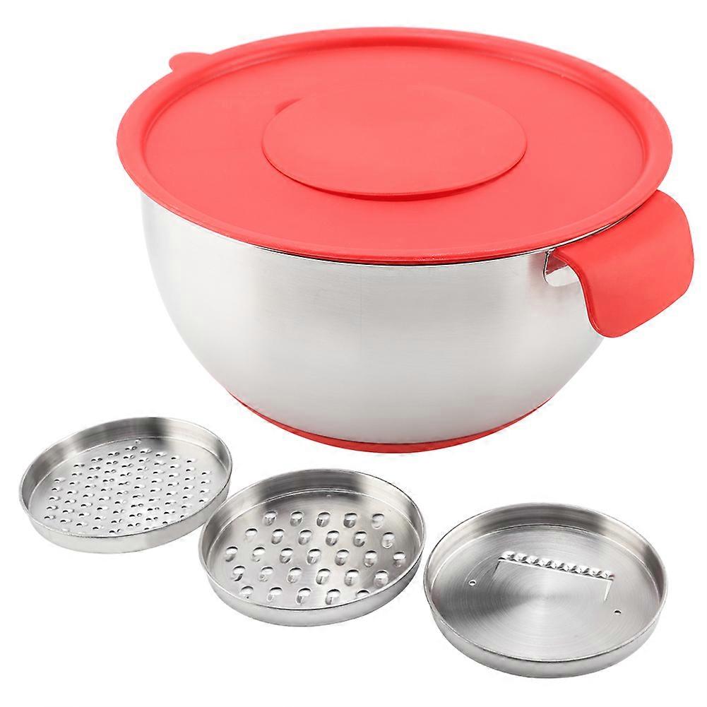 1Made of high quality stainless steel, rust proof and durable 2Surface is polished, beautiful appearance, concise and smooth 3The bottom is covered with silicone, which does not hurt the table and is non-slip 4Comes with a grater for easily grating vegetables and fruits 5With handles for easy grip and lid, a good helper using in kitchen