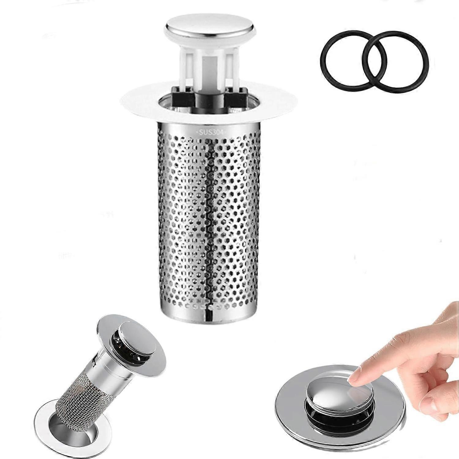 Sink Drain Stopper:Pop-up drain filter design subverts traditional and inconvenient drainage methods (such as basic plug with chain)! You can switch between the two modes, plug (water storage) and filter (water drainage), just by lightly pressing the top cover. Build in Strainer: Unlike regular button drain,this drain stopper has a anti-clogging basket strainer inside that neatly collecting hairs and prevents the drain from clogging. No jewelry, rings, dirt and other things will enter the drain pipe. Tough Material: The pop-up sink drain pipe is made of thickened and stainless steel material, which is characterized by explosion-proof and crack-proof, durable, smooth and comfortable to the touch, rust-proof, corrosion-proof and discoloration-proof. Easy to Install: Anyone can install the pop-up drain fliter, because it has a simple structure and doesn't need any tools. Just take out the old sink drain stopper and insert the bouncing core. Widely Used: Available in a variety of sizes, suitable for 99% of floor drains and sinks, such as kitchen sink, bathroom sink, floor drain, water pipe,etc.