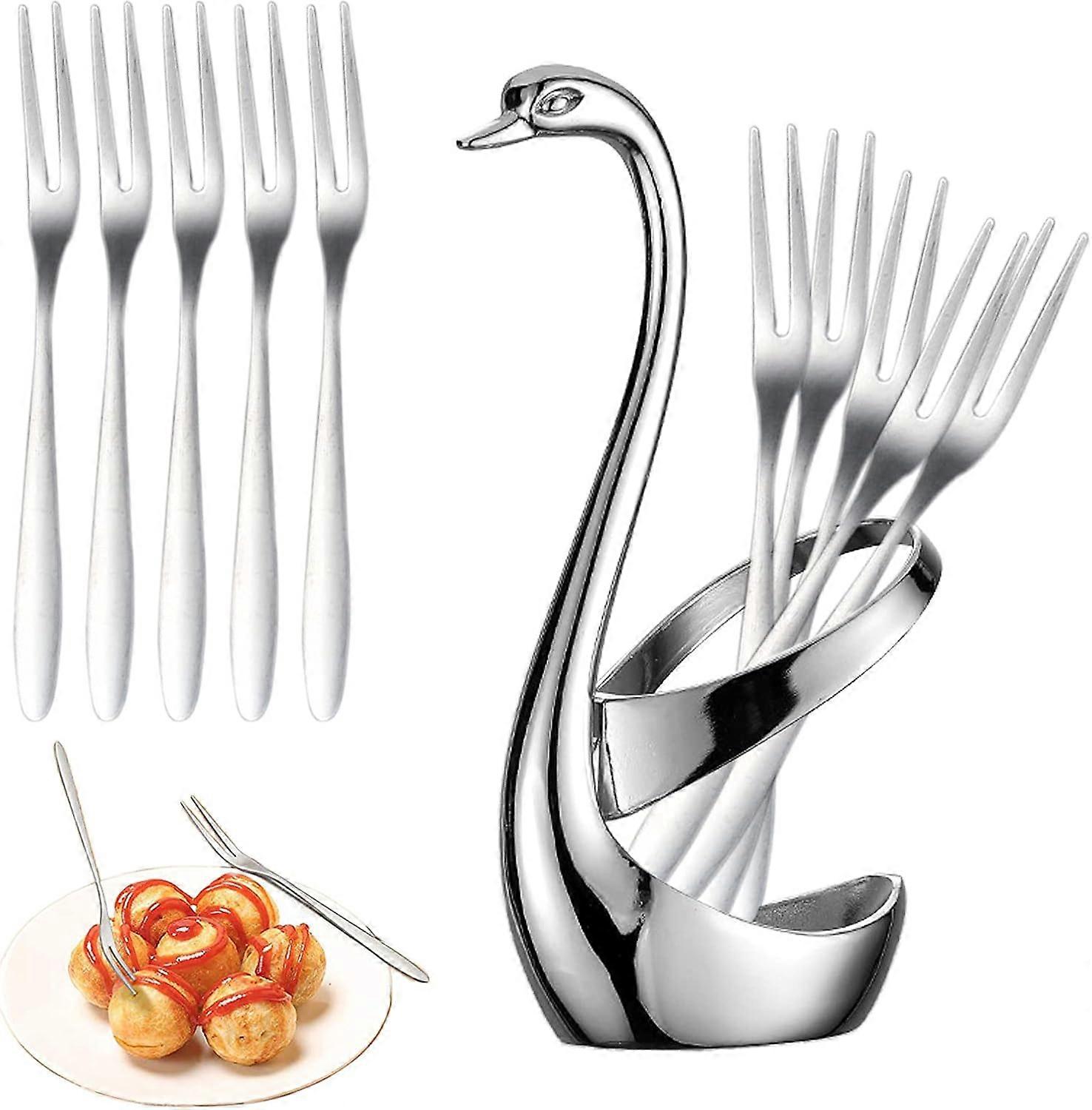 Stainless Steel Fruit Forks Set, Cutlery Set with Swan Base, Storage Rack with 10 Forks, for Cakes, Vegetable Salads, Desserts, Fruit, Table Forks, Pa