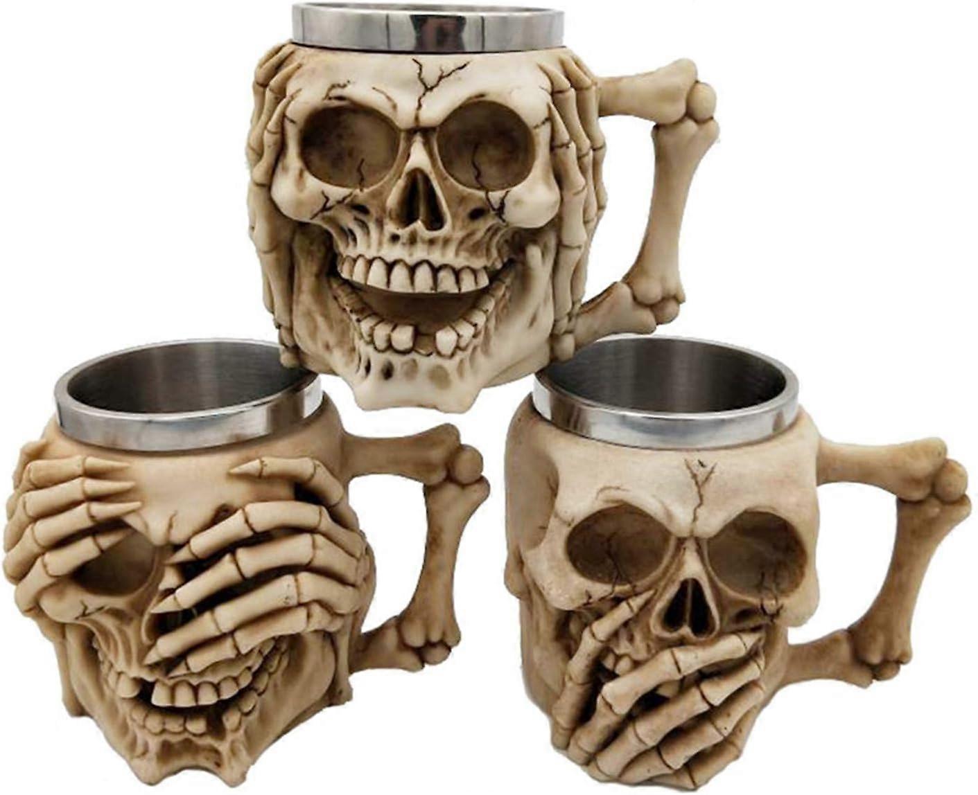 Stainless Steel Resin Coffee Cup Skull Wine Glass Kitchen Mug Beer Mug Emoji Cup Halloween Decoration, Party Bar Drinkware (3 Piece Set) 400ML