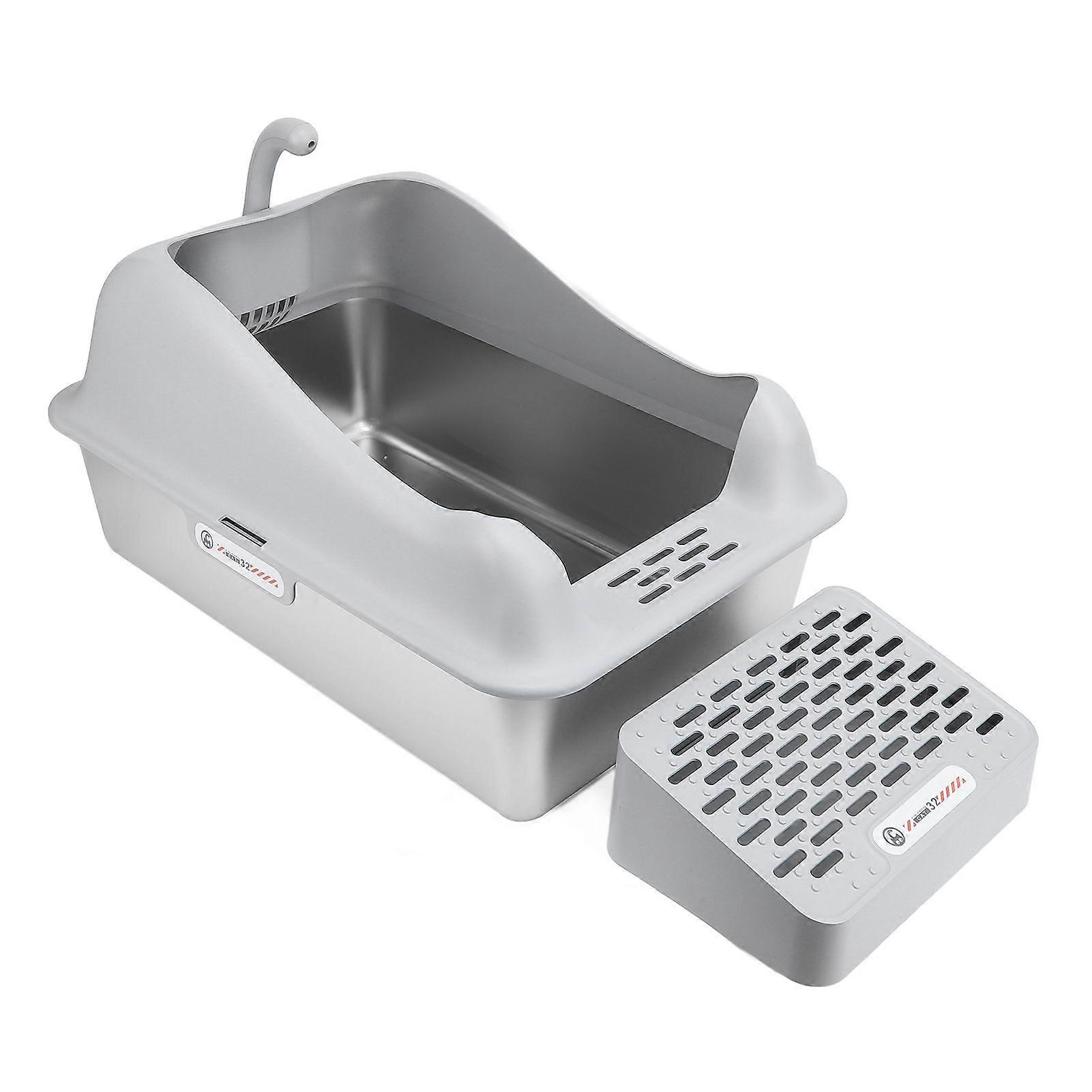 Feature:1. CONVENIENT TO USE: Provides spacious space for large cats and multi cat households. Capacity of 20 liters reduces cleaning frequency, allowing you to leave home worry free for up to 30 days.2. LEAKPROOF DESIGN: Top and bottom of the covered stainless steel litter box overlap closely, greatly reducing the possibility of leakage. Higher sides and more fences prevent litter from splashing when cats urinate at height.3. SECURE BUCKLE CONNECTION: The enclosed cat litter box is securely connected to the high walls with buckles, like a lock, very sturdy. No need to worry about the top cover falling off even if you have a naughty cat.4. TILTED FOOT PEDAL: With double layer litter collection foot pedals, it reduces litter tracking, and the carefully designed tilted foot pedals are also suitable for short legged or smaller cats.5. UPGRADED MATERIALS: The litter box is made of ABS shell and stainless steel, easy to clean, reliable and rust proof, and the upgraded design ensures that it won't collect any residue or odor.Specification:Item Type: Cat Litter BoxMaterial: Metal, plasticSize: Approx. 600x400x300mm / 23.62x15.75x11.81inPedal Size: Approx. 201x284x100mm / 7.91x11.18x3.94in.Package List:1 x Cat Litter Pan(2 Assembly Parts)1 x Pedal 1 x User Manual 1 x Cat Litter Shovel 4 x Non Slip Mat