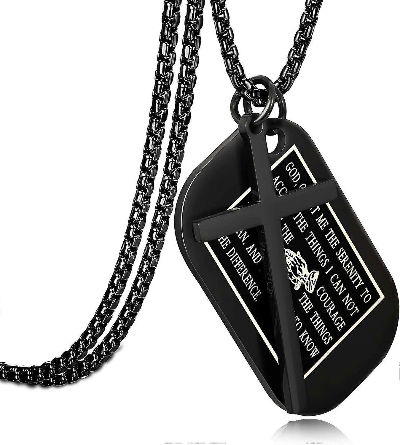 Stainless Steel Dog Tags Cross Necklaces for Men Prayer Cross Necklace Military Rolo Chain 3mm 24 Inch Black Serenity Prayer