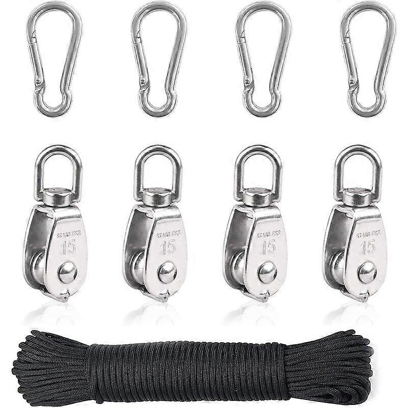 [Super High Quality]: Sturdy design, exquisite craftsmanship, durable, wear-resistant, strong load-bearing capacity, high structural strength and 360 degree flexible rotation.[Perfect Combination]: Contains: 4 M15 pulley blocks, 4 carabiner snap hooks, 31m/4mm nylon. M15 Pulley Block - Max Load: 35kg - Spring Carabiner - Max Load: 200kg - Tension Rope: 4mm x 31m - Max Tension: 100kg.[Unique Design]: Ergonomic design, fixed top for easy rope guidance, smooth roller provides good traverse, the cylinder head is strong, durable, 360 degree rotation to prevent the rope from tangling.[Wide Application]: This single pulley block is suitable for many applications, can be used for indoor and outdoor ropes, garage, machine loading, curtain, washing line, dog pulley system, etc.,"