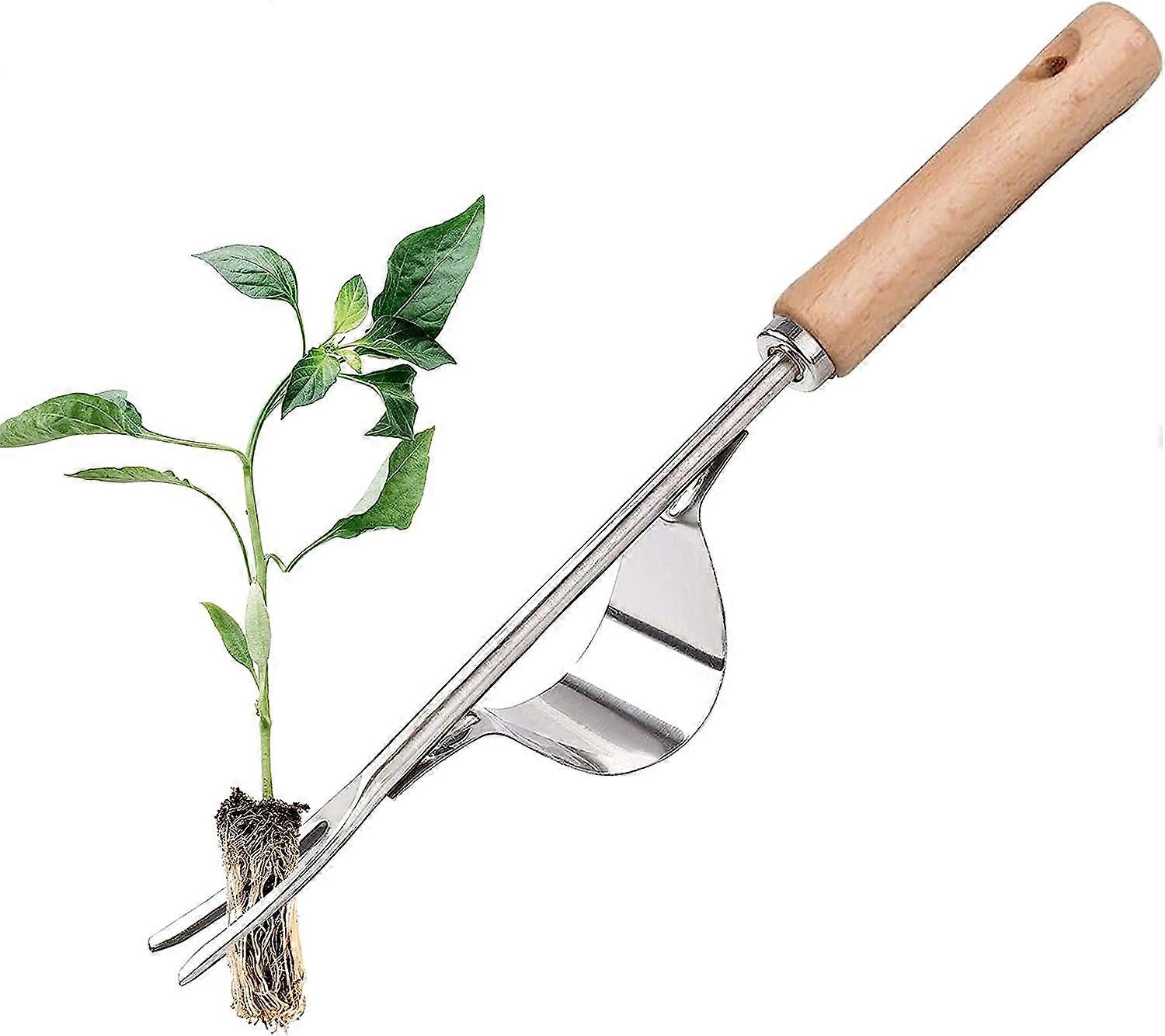 Easy to Use: Base designed with the principle of leverage and a strong V-shaped fork tip - Simply rest the curved metal and use the sharp fork to lift the roots, stem, it is a great tool for eliminate the weeds and transplant flower seedlings.