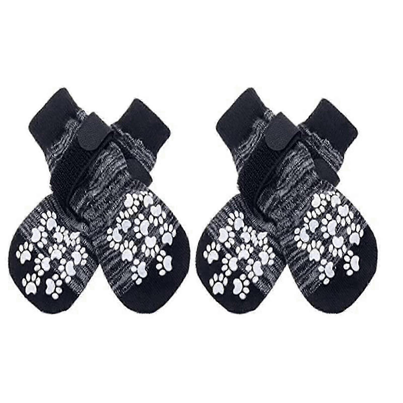 Warm NOTE: The product comes with a Christmas card so you can give the product as a Christmas gift to your friends or family at Christmas. Size Material: cotton. Pack of four (2 pairs). Size: S size: sole width 5cm, sock length 15cm M size: sole width 6.5cm, sock length 16cm L size: sole width 7cm, sock length 18.5cm. Non-slip bottom design. Measure the width of the claw and choose size.) Double-sided Anti-slipOur dog socks have a large area of non-slip silicone. These non-slip silicone can enhance the dog's traction control on the ground and make it less prone to slipping. Especially useful in homes with particularly smooth floors. In addition, the upper and lower sides of the socks are sewn with non-slip gel to ensure that the socks can also play a good anti-slip effect when the socks are turned over. Wide ApplicationsThe non slip pet socks can be applied indoors to ensure safe movement of pets in smooth places, if your baby's paws have a problem slipping on wood floors, we recommend you buy these socks with a anti-slip adhesive. They also prevent dogs from licking and irritating wounds, further helping to heal foot wounds. Likewise, they can also be used for warm use in winter. High-quality FabricThese dog socks are made of high quality cotton, which is elastic, soft and breathable, and makes your fur friends easier to accept and won't make the dog feel stuffy. Perfect for indoor wear. They are printed with a cute paw pattern and have detachable and adjustable strips. Anti-Fall OffThis non slip pet socks uses adjustable and detachable belt, which makes the socks keep stay on your lively and naught pet's paw, never fall off easily. You can use elastic black loop fastener to adjust the tightness of your dog's sock, but don't fix it too tightly. In addition to the magic tape fixation, the sock tail is designed to be tightened, which is elastic to further prevent the socks from falling off.