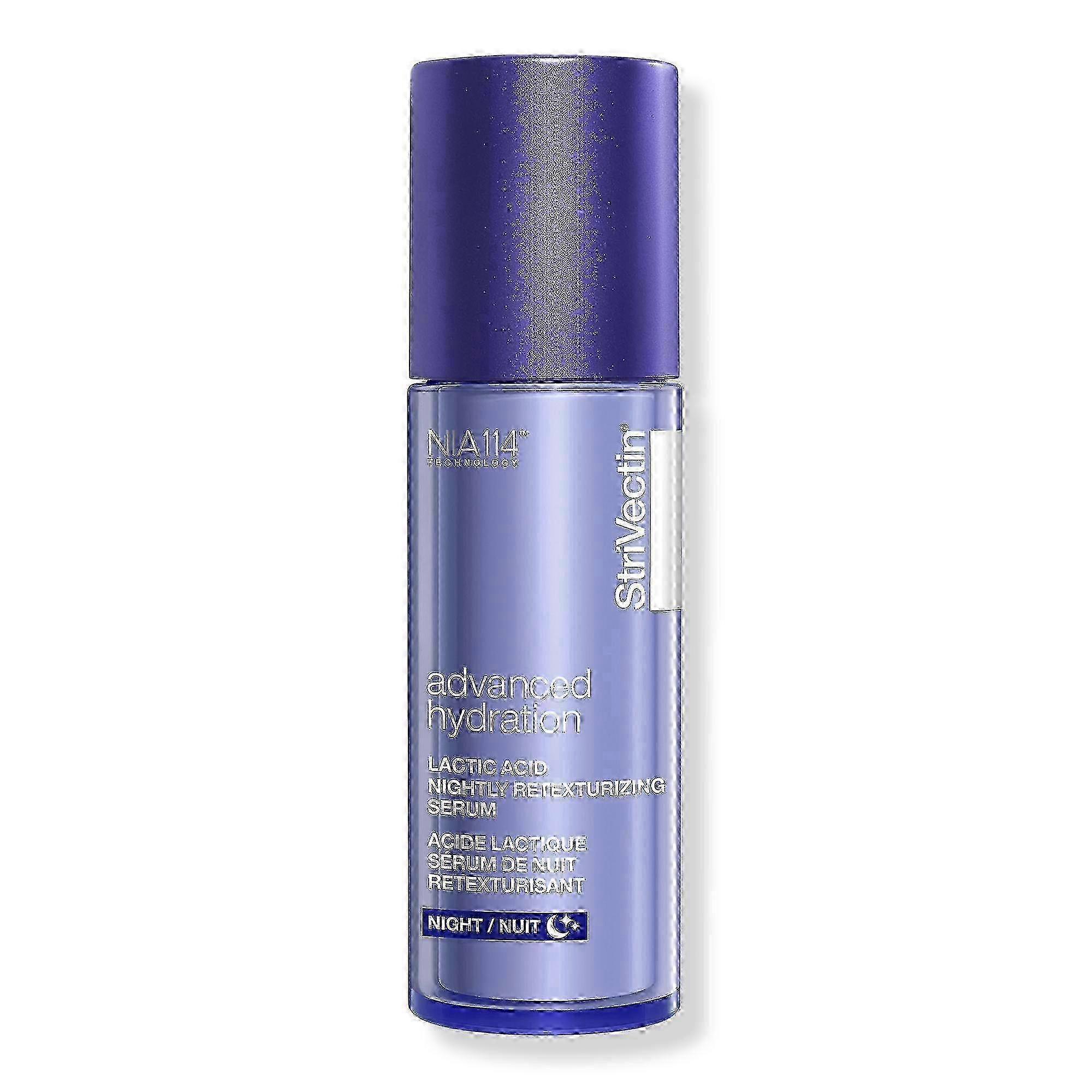 Expert exfoliation meets advanced hydration with Lactic Acid Nightly Retexturizing Serum, a potent yet gentle serum from StriVectin.BenefitsExfoliates & hydrates to reveal super soft, ultra-smooth skinReveals a clarified, even-toned, radiant complexion overnightMinimizes the appearance of fine lines and poresAll StriVectin product packaging is nationally recyclable in partnership with TerraCycleKey IngredientsLactic Acid exfoliates and smooths while helping to improve skin's natural moisturizing factors for a glowing, baby-soft, visibly renewed complexionInfused with patented NIA-114Dry skin-soothing Blue Cypress and a youth-boosting overnight Nonapeptide for revitalized radiance by morningClinical ResultsAfter Just One Use:*100% showed improvement in radiance97% showed improvement in softness & overall appearance*Based on results from an expert clinical grader evaluation overnight/one-time use on 35 panelistsClinically Tested to be Gentle on Skin Inactive Ingredients: Water/Aqua/Eau, Caprylic/Capric Triglyceride, Glycerin, Caprylyl Methicone, Lactic Acid, PEG-12 Dimethicone/PPG-20 Crosspolymer, Lactococcus Ferment Lysate, Dimethicone, Hibiscus Sabdariffa Flower Extract, Hydrolyzed Opuntia Ficus-Indica Flower Extract, Polygonum Cuspidatum Root Extract, Laminaria Digitata Extract, Cocos Nucifera (Coconut) Fruit Extract, Oryza Sativa (Rice) Bran Extract, Callitris Intratropica Wood Oil, Nonapeptide-1, Myristyl Nicotinate, Bisabolol, Adenosine, Diatomaceous Earth/Solum Diatomeae/Terre de diatomées, Dimethicone/Polyglycerin-3 Crosspolymer, Cetyl PEG/PPG-10/1 Dimethicone, Sorbitol, Lecithin, Caprylyl Glycol, Ethylhexylglycerin, Hexyl Laurate, Tocopherol, Glyceryl Caprylate, Silica, Disodium EDTA, Dipropylene Glycol, Xanthan Gum, Polyglyceryl-4 Isostearate, Sodium Phosphate, Parfum/Fragrance, Magnesium Sulfate, Disodium Phosphate, Magnesium Hydroxide, Mica, Tin Oxide, Pentaerythrityl Tetra-di-t-butyl Hydroxyhydrocinnamate, Sodium Citrate, Sodium Chloride, Phenoxyethanol, Sodium Benzoate, Benzyl Benzoate, Limonene, Linalool, Citral, Citronellol, CI 77891 (Titanium Dioxide), CI 77510 (Ferric Ferrocyanide). Suggested Use: Apply to clean face, avoiding eye area, in the evening before moisturizer. Precautions: Sunburn Alert: This product contains an alpha hydroxy acid (AHA) that may increase your skin's sensitivity to the sun and particularly the possibility of sunburn. Use a sunscreen, wear protective clothing and limit sun exposure while using this product and for a week afterwards.