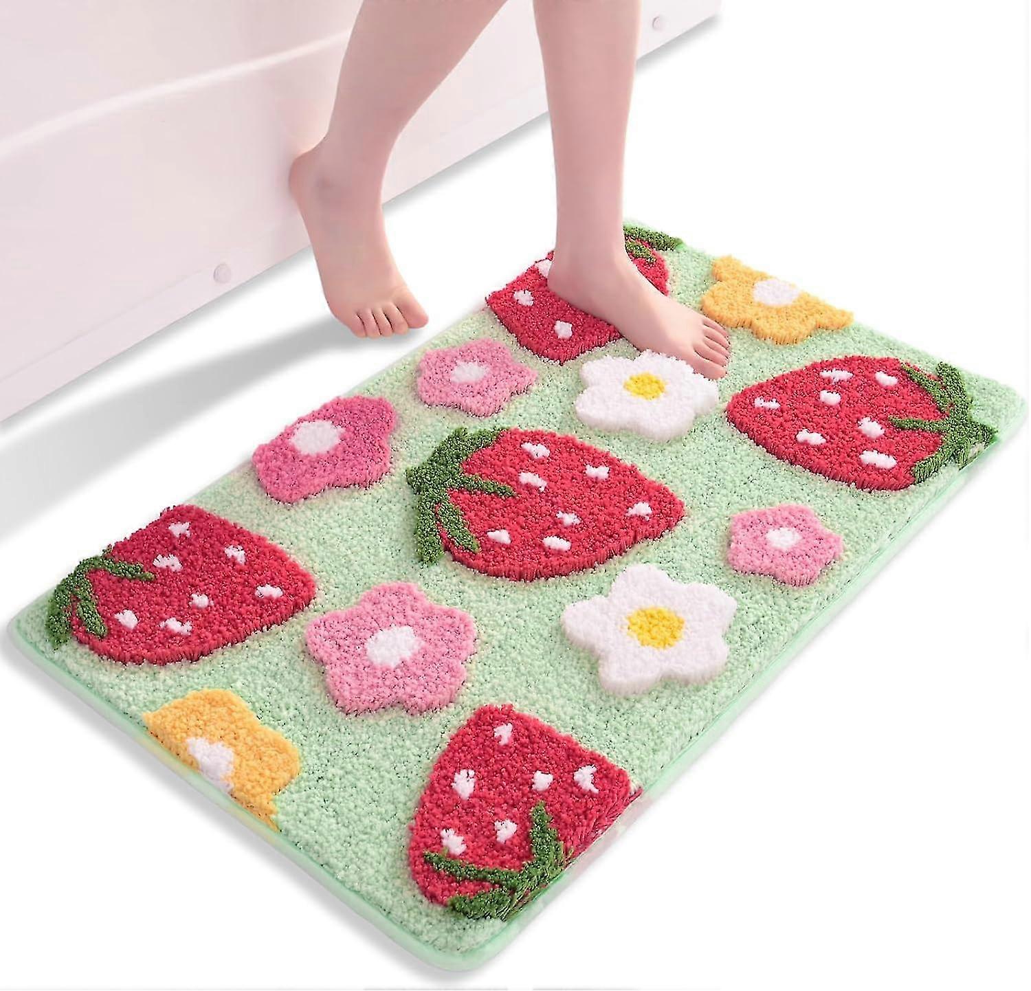 Strawberry Green Bath Mat, Non-Slip, Washable, Multicolor, Soft Microfiber, Absorbent, 45 x 65 cm