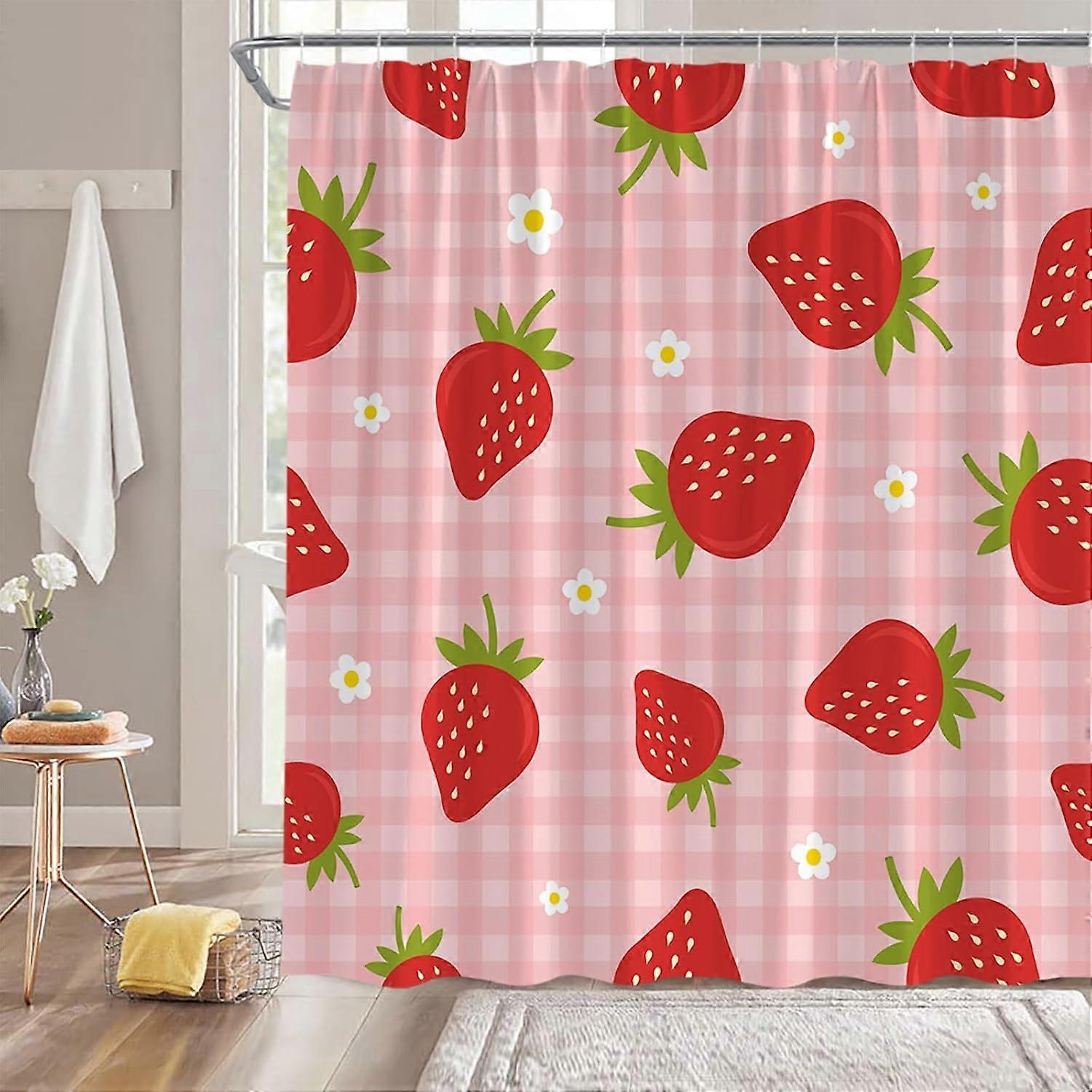 Strawberry Shower Curtain Cute Pink Strawberry Red Fruit Watercolor Strawberries Spring Summer Fruits Floral Fabric Bathroom Decor Curtain with Hooks