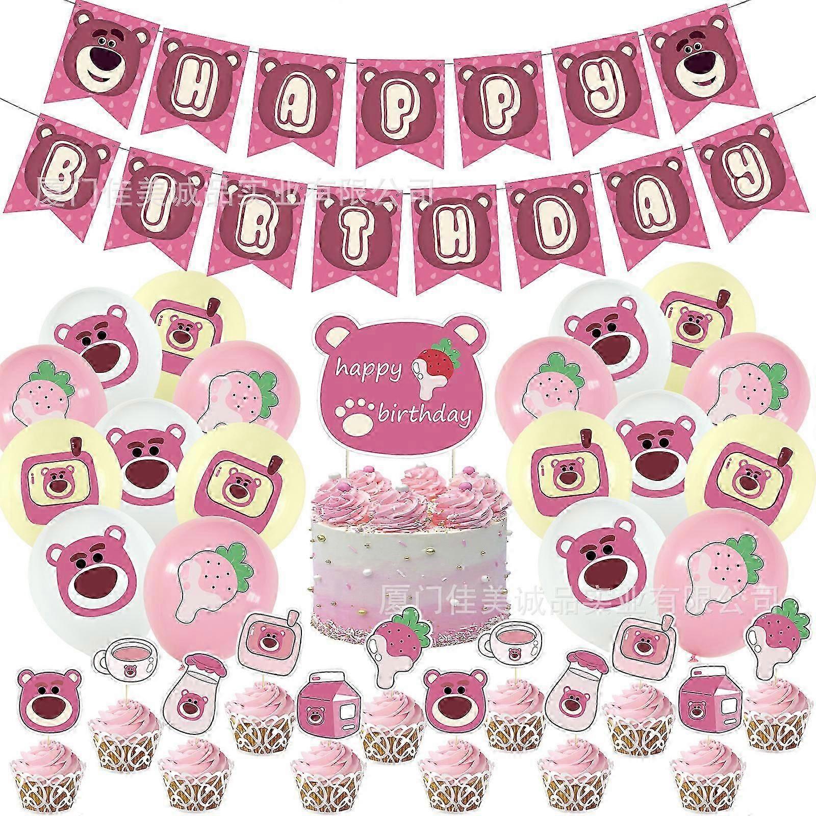 Strawberry Bear Theme Children's Birthday Party Decoration Set Letter Pull Flag Cake Flag Latex Balloon
