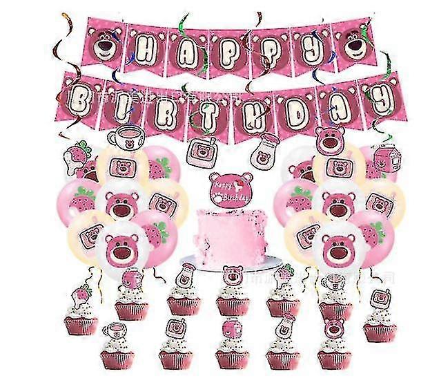 Strawberry Bear Theme Children's Birthday Party Decoration Pull Flag Cake Flag Balloon Decoration Set